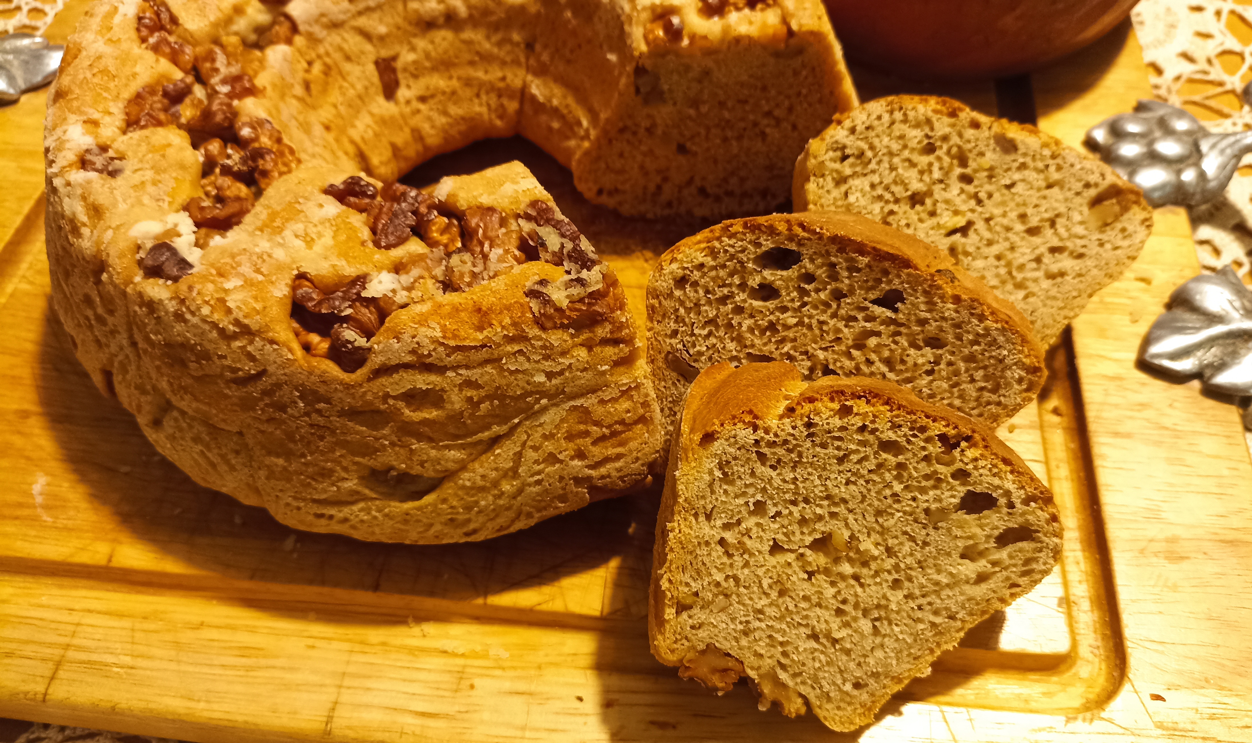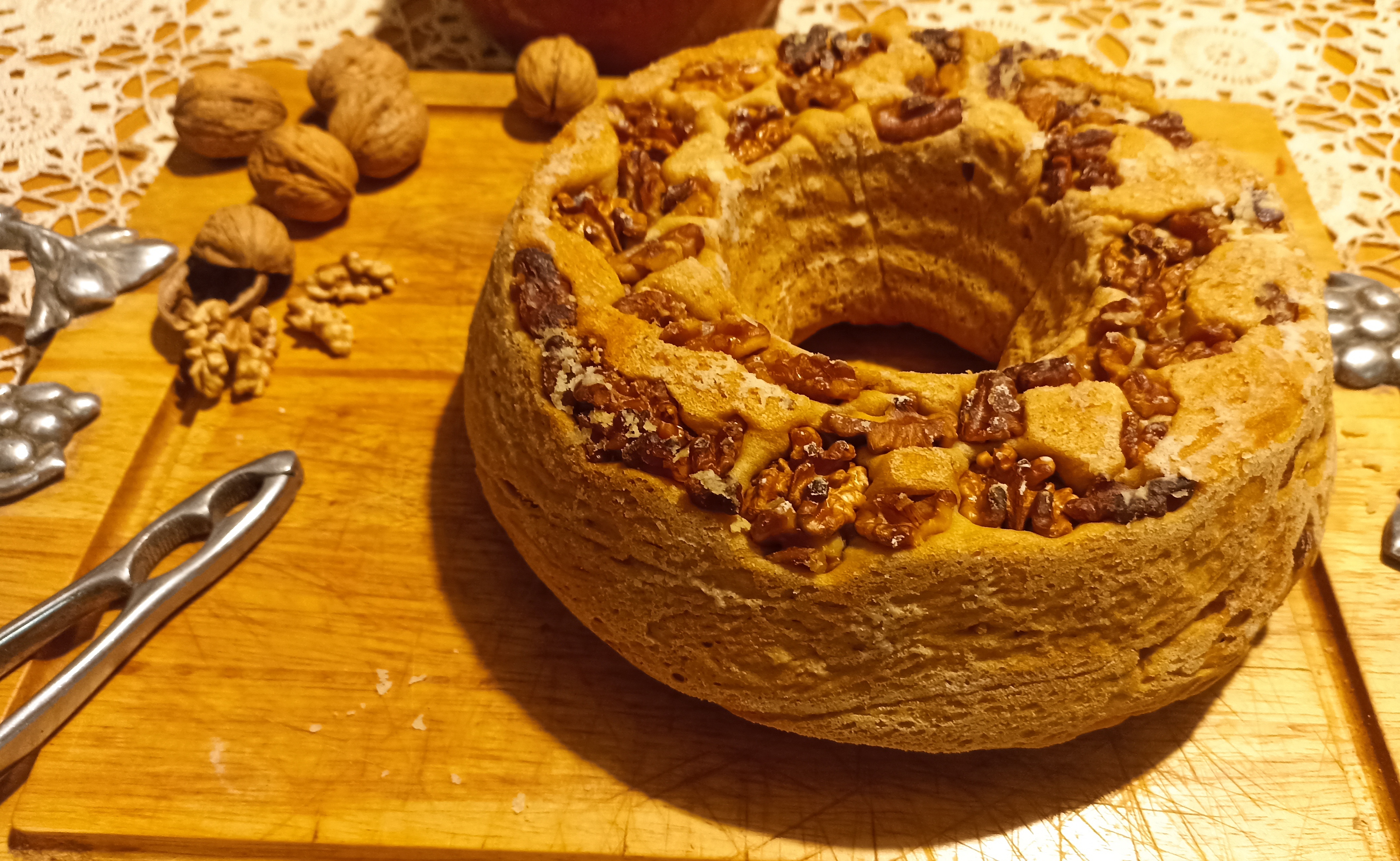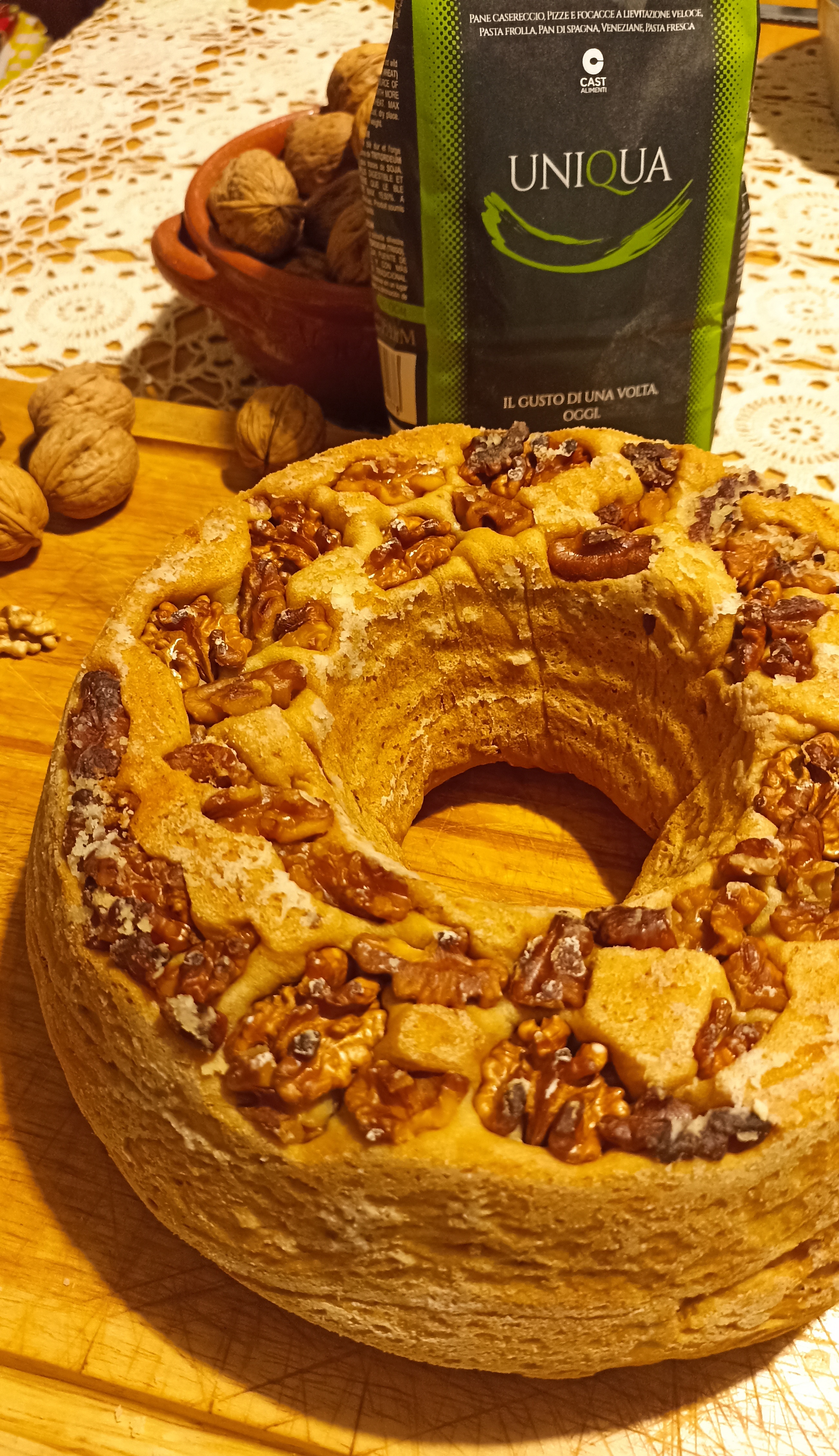 Adoro fare il pane in casa e sperimentare nuove ricette, oggi ho impastato il pane con le noci, ho realizzato questa fantastica ciambella utilizzando ingredienti semplici e salutari.