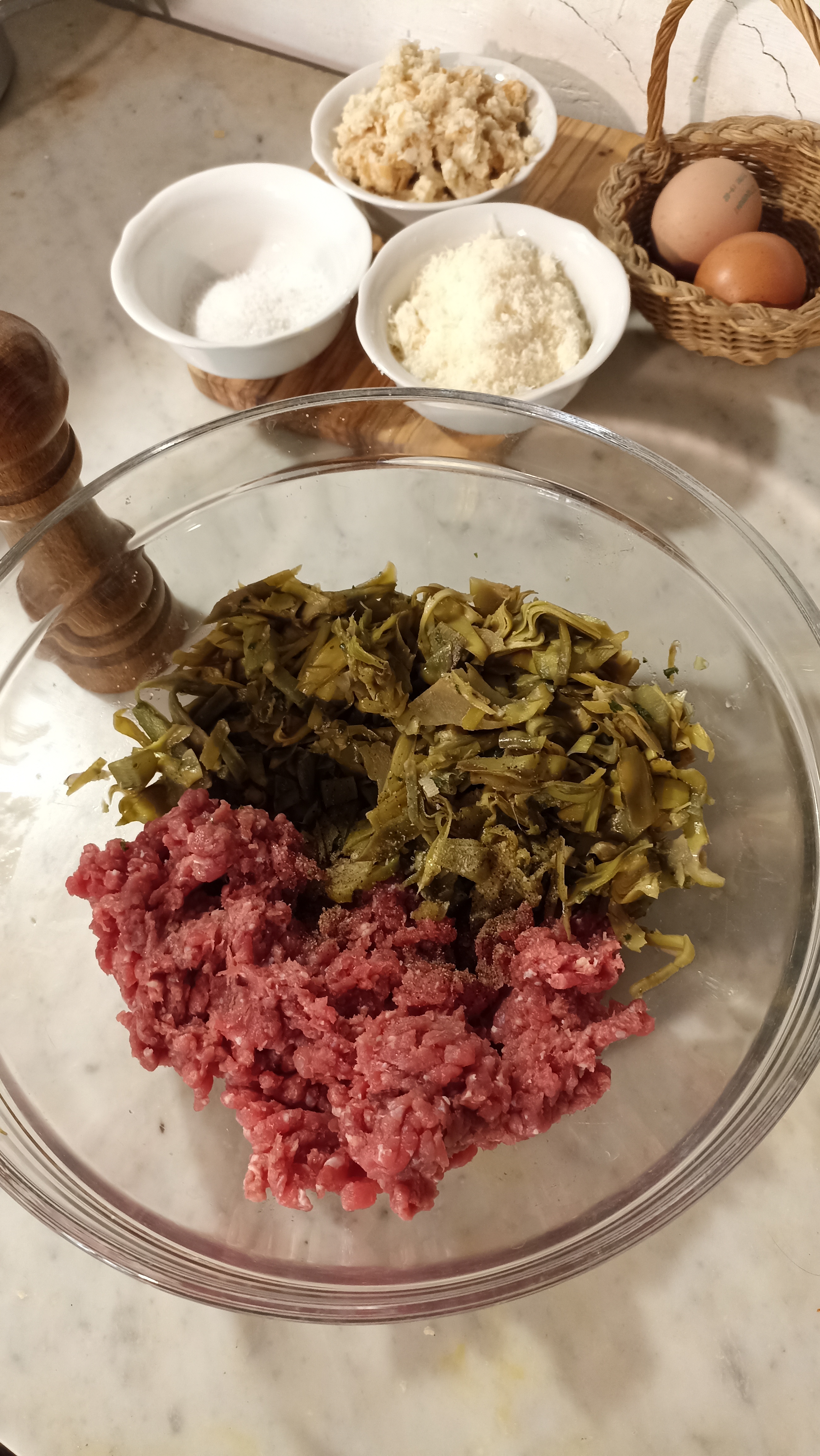 In una ciotola mettete la carne macinata, i carciofi (lasciatene da parte 3-4 cucchiai), le uova, il pane bagnato nel latte (strizzato), il parmigiano grattugiato, il pangrattato, una spolverata di pepe e aggiustate di sale.