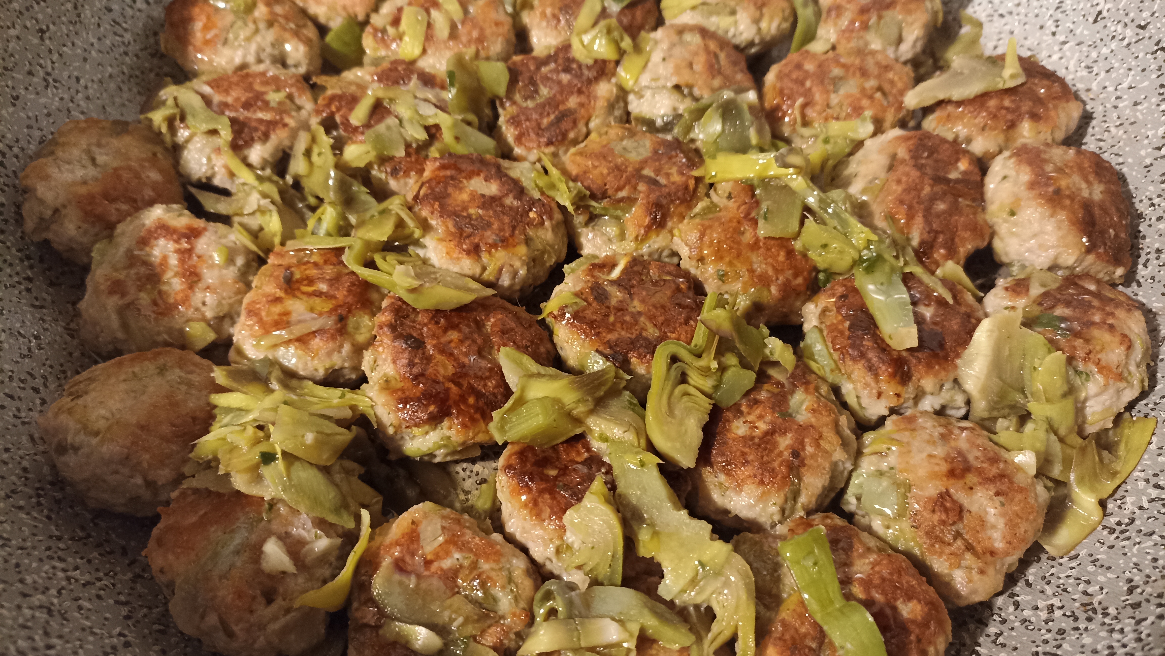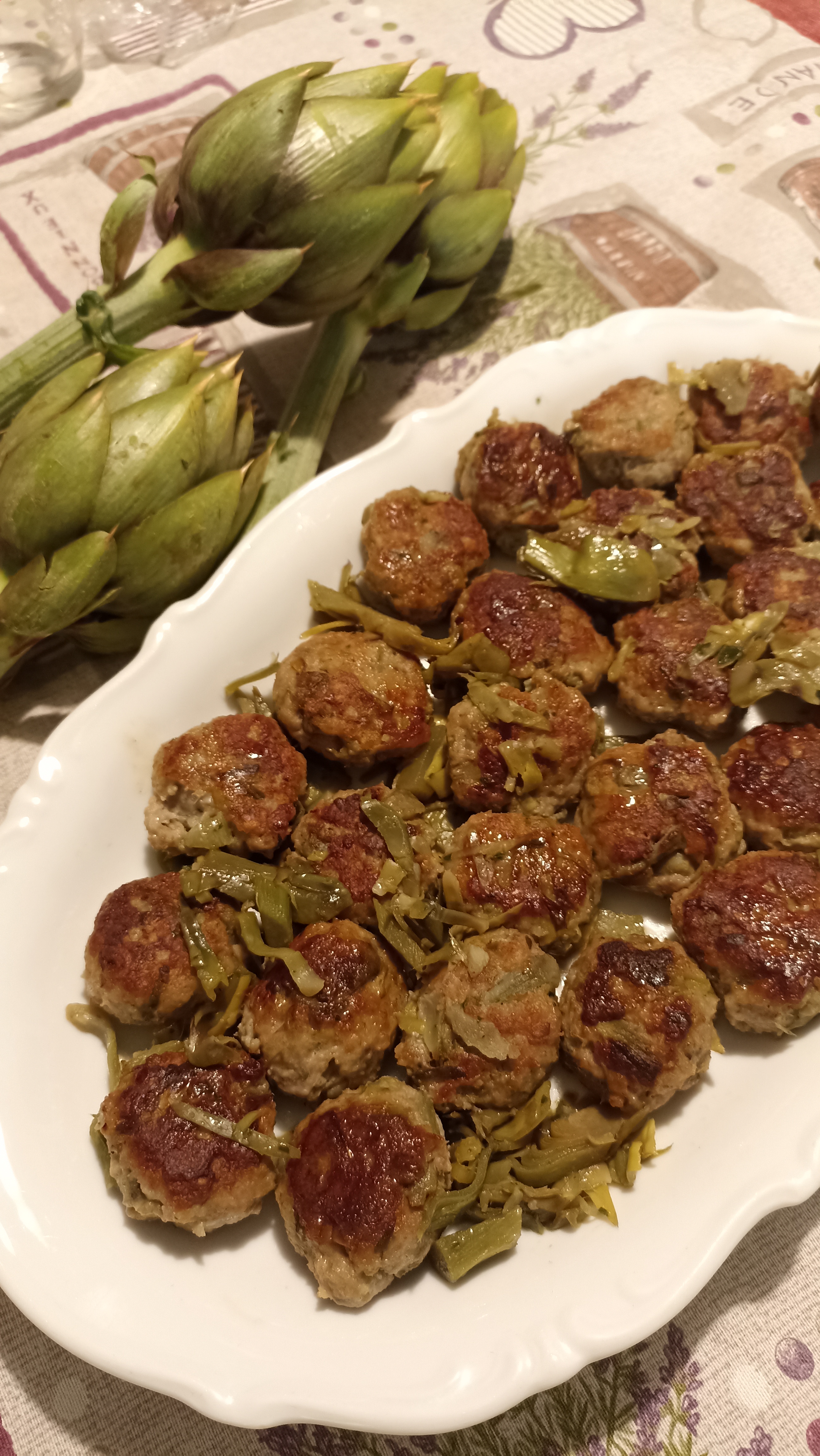 in una grande padella rosolate in poco olio le polpette (4-5 minuti poi giratele e fatele dorare altri 4-5 minuti dall’altro lato). Aggiungete quindi i carciofi tenuti da parte e mescolate delicatamente.