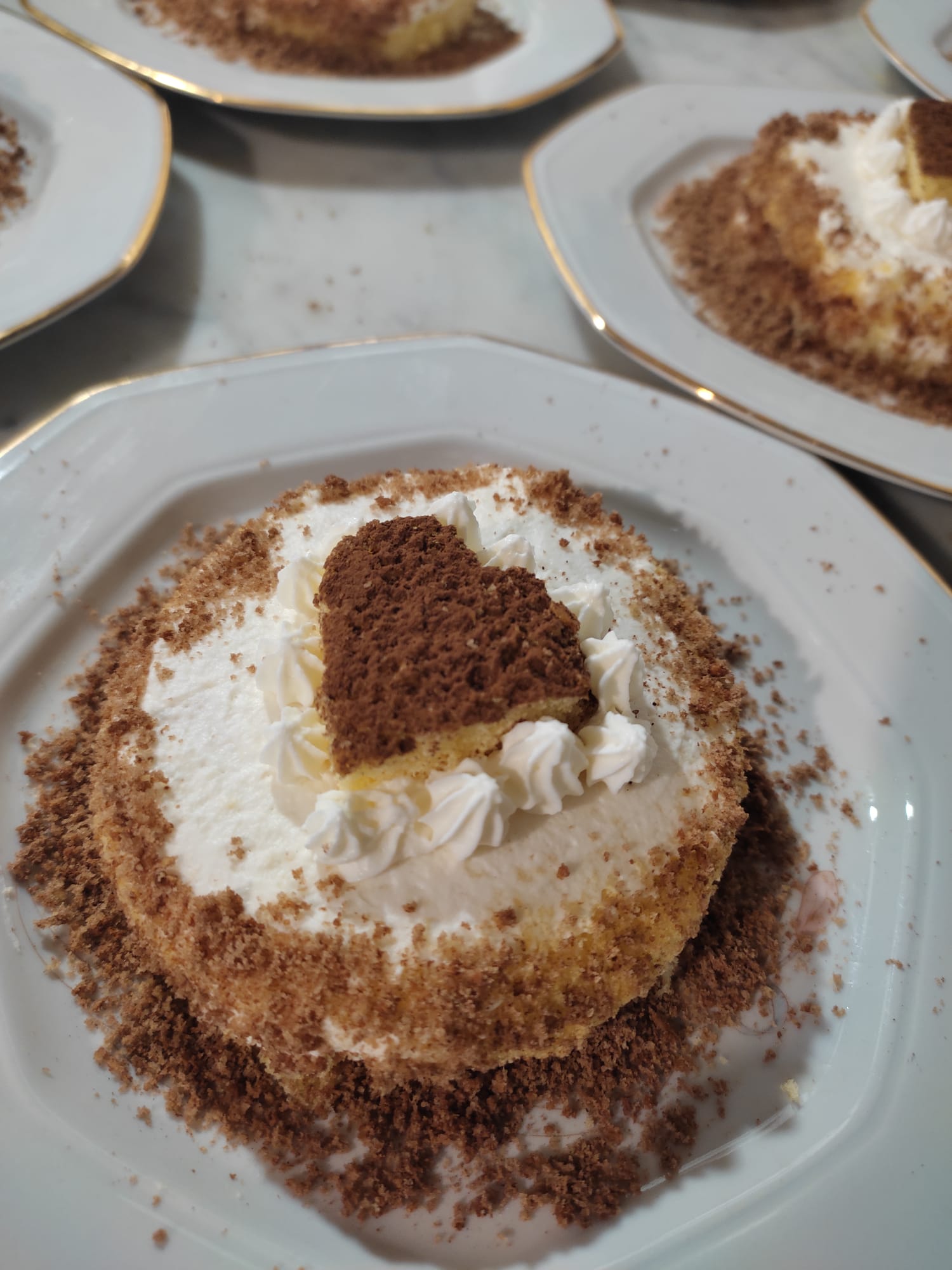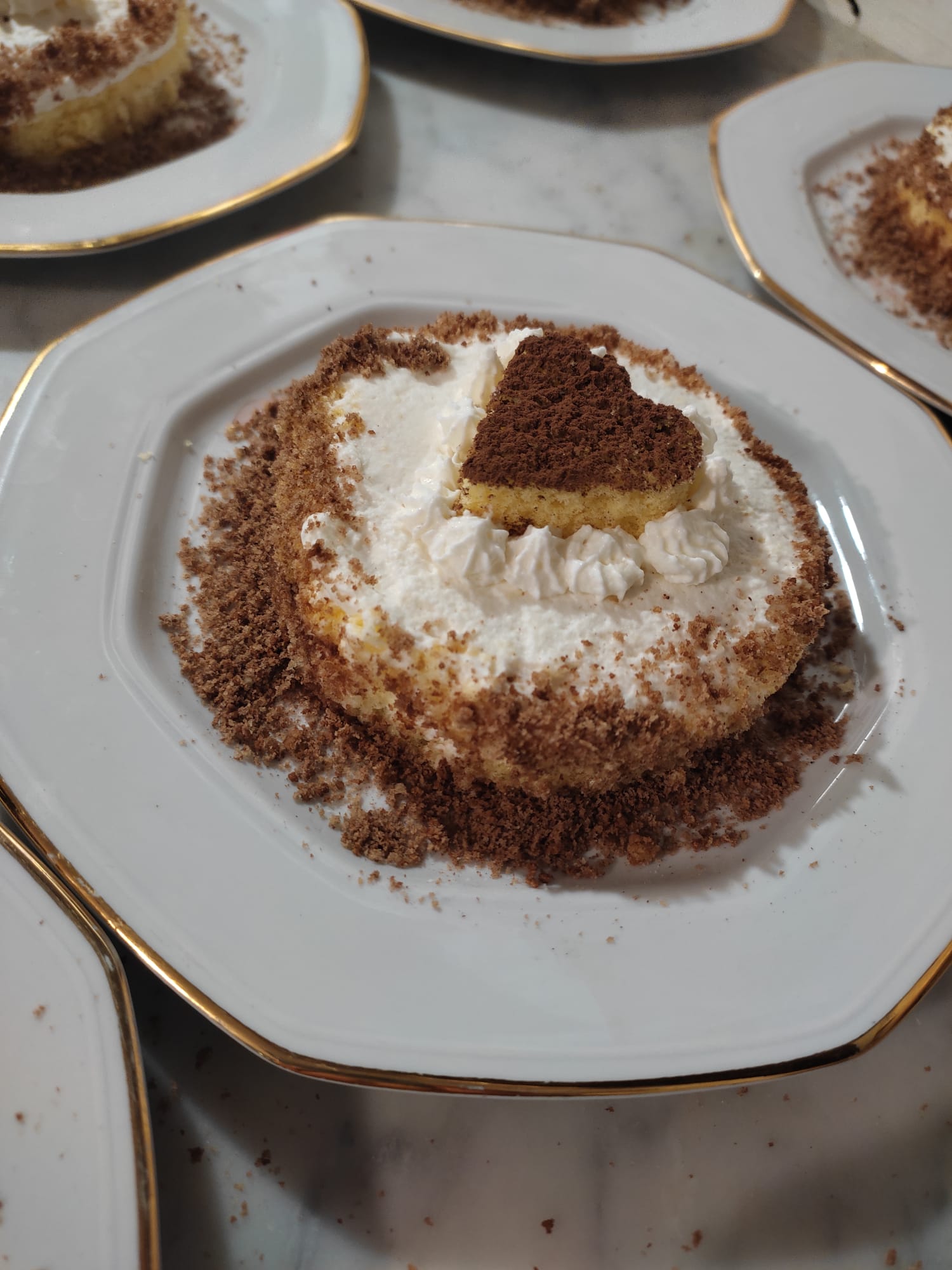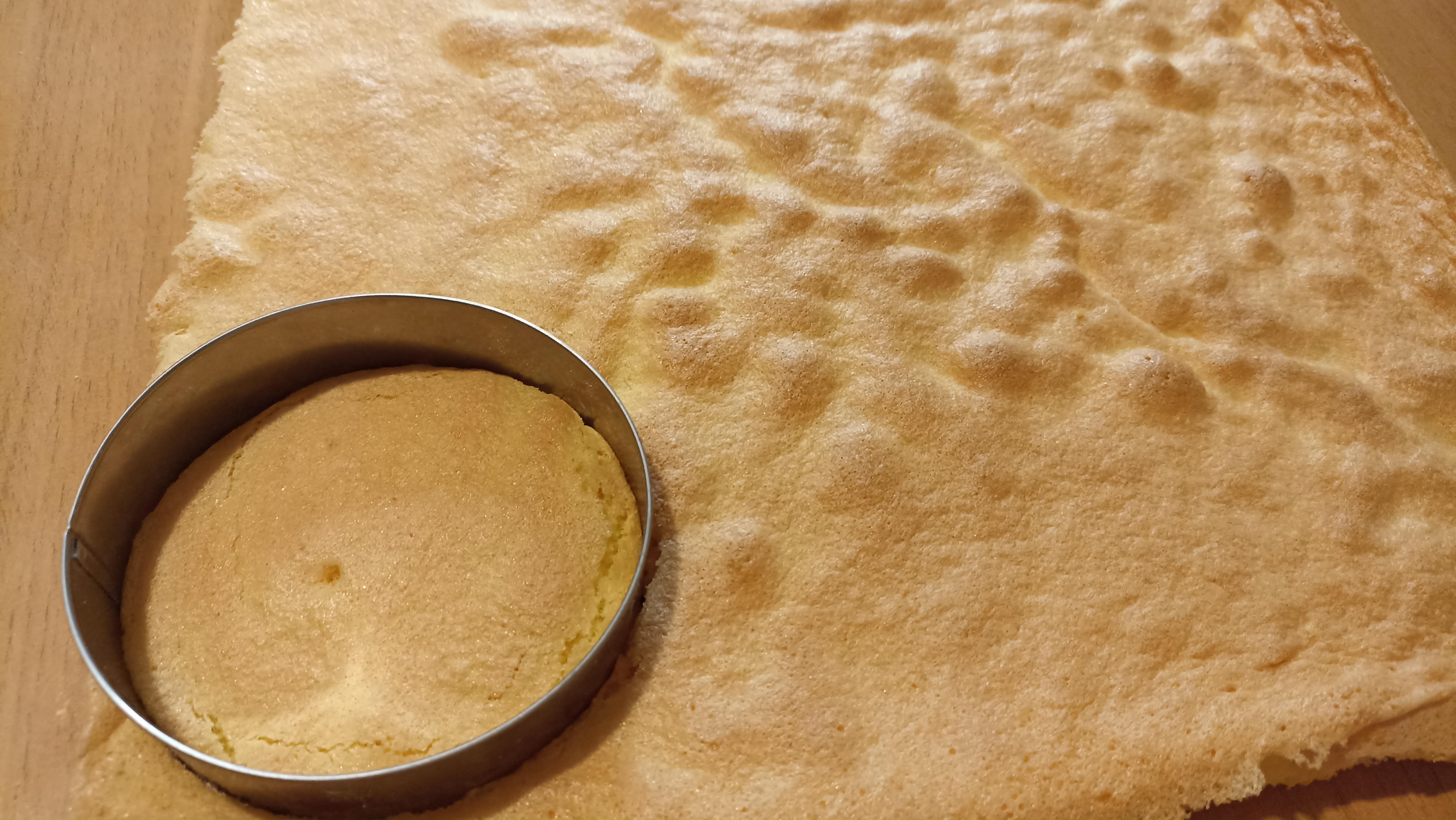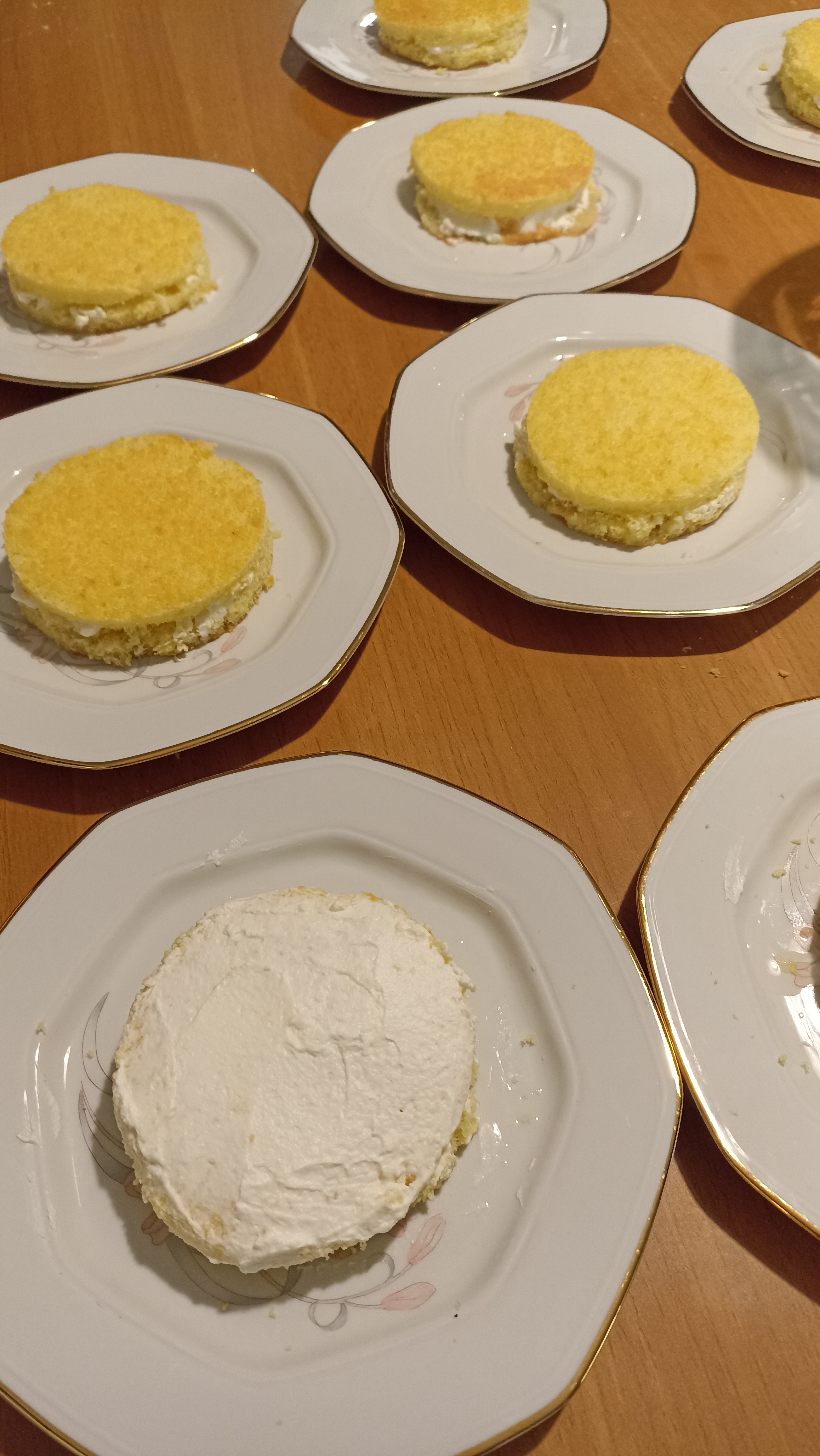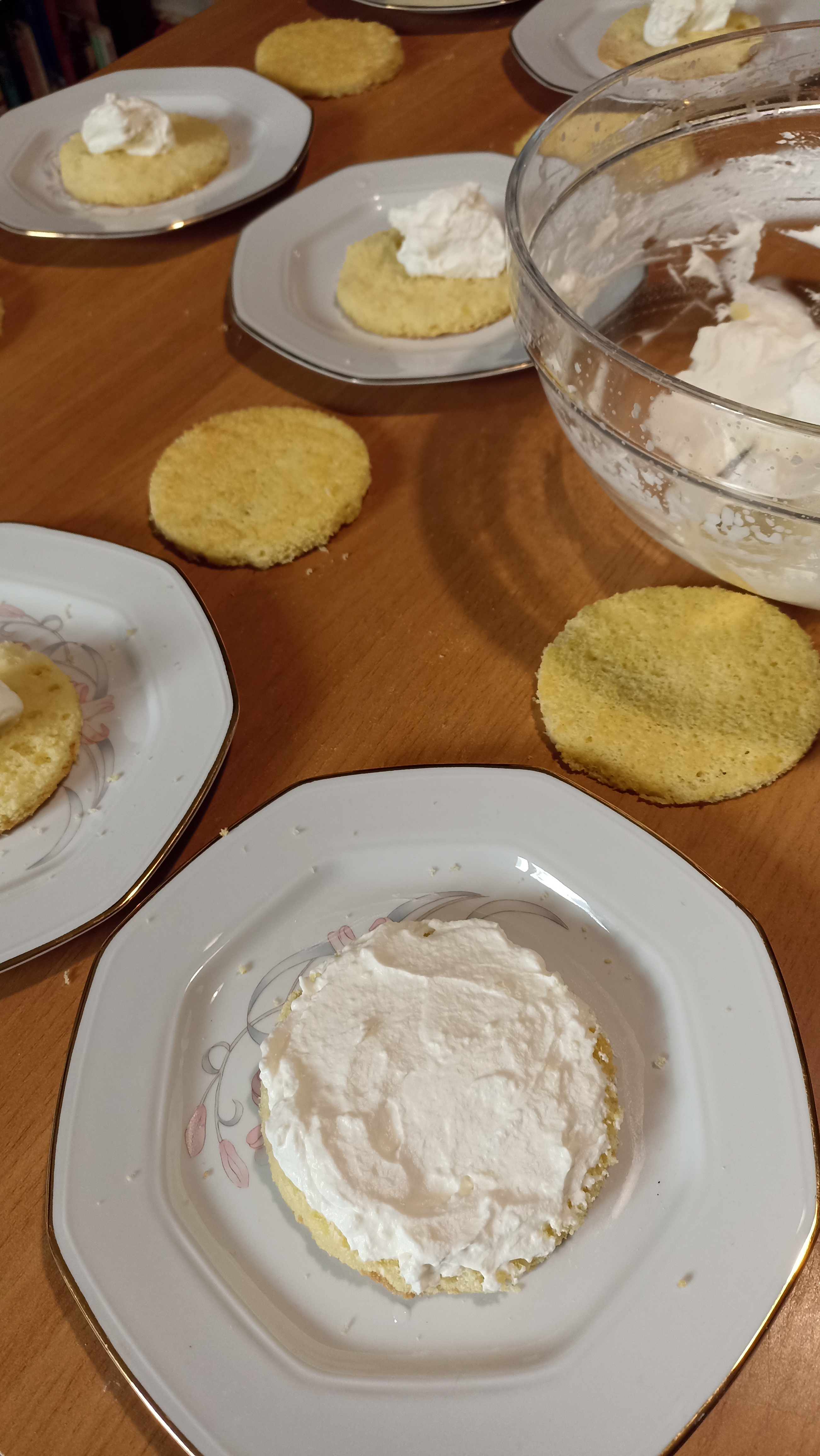 Ponete la base del dischetto su un piattino e bagnate con 2-3 cucchiai di bagna. Spalmate un po’ di panna, coprite con l’altra metà del dischetto, bagnate con 2 cucchiai di bagna e spalmate altra panna.