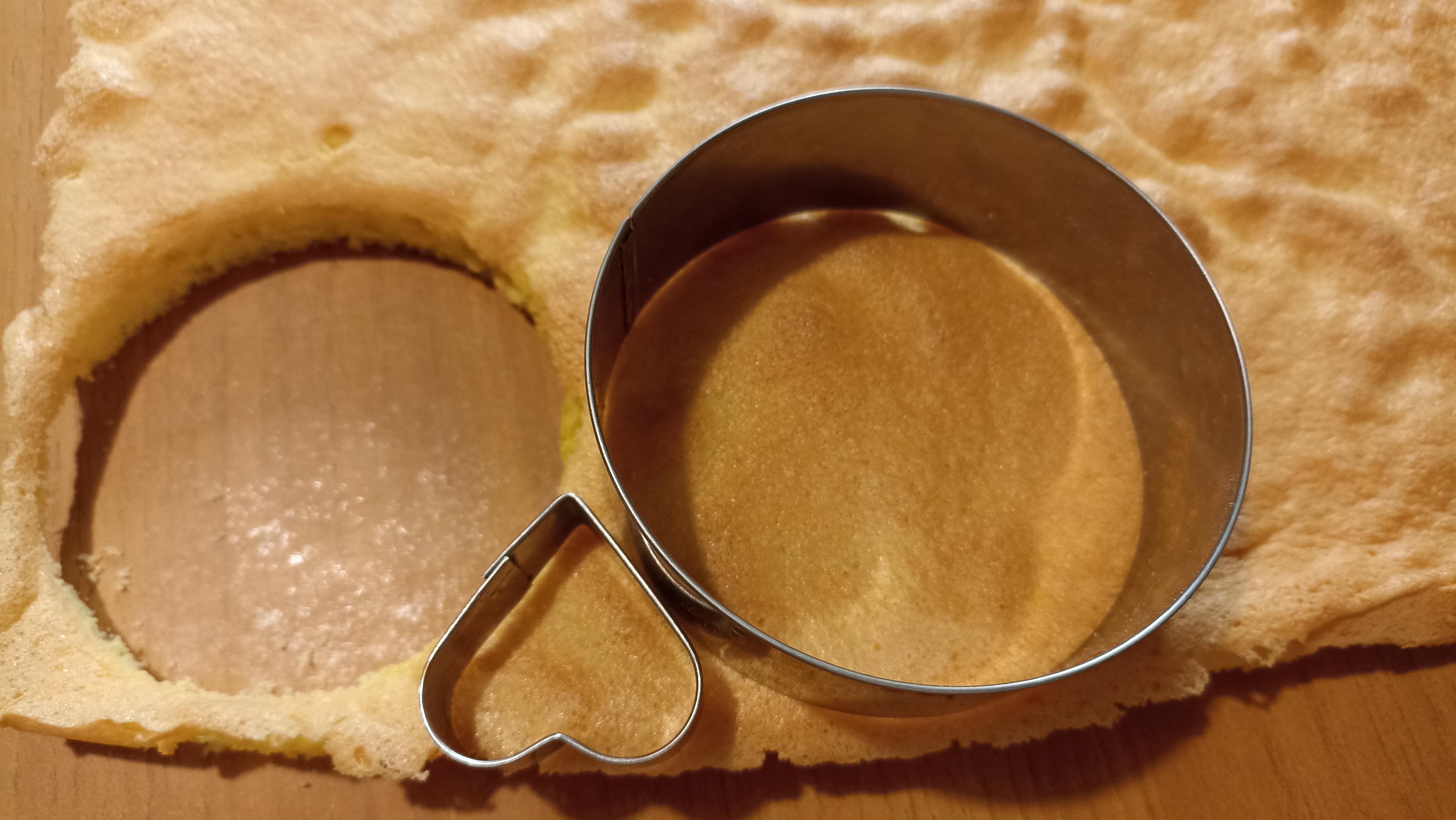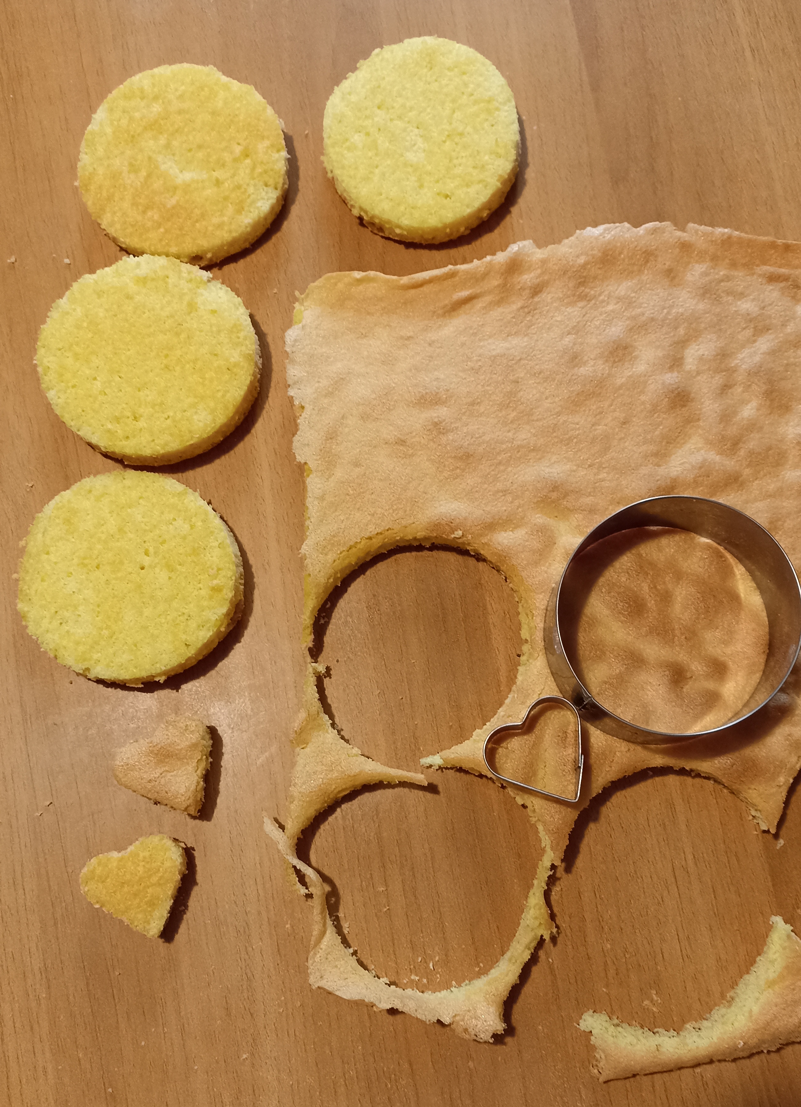 Con un coppapasta da cm 10 di diametro (o con una tazza) ricavate dalla base 9 dischetti e con uno stampino per biscotti, ricavate 9 cuoricini.