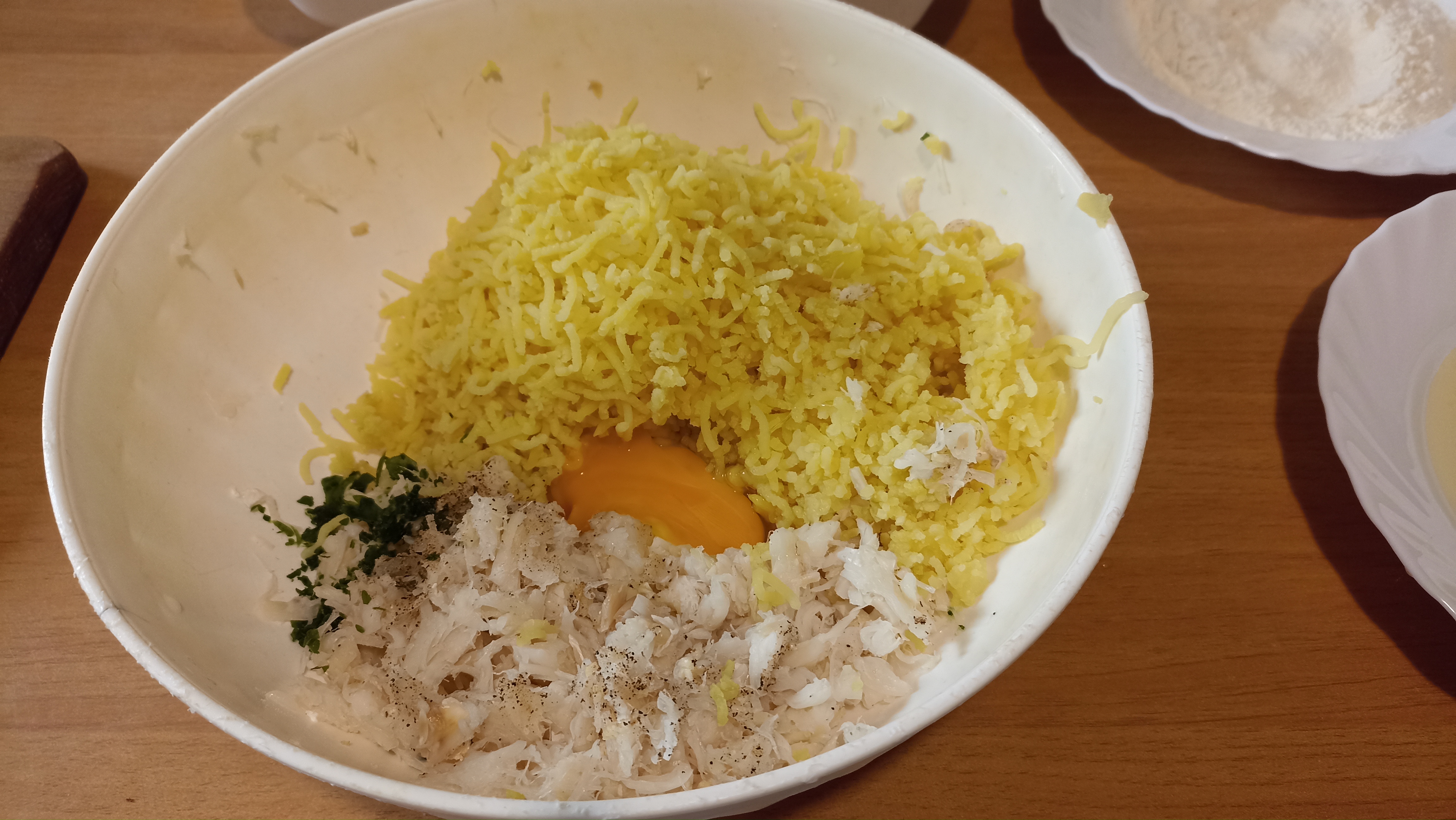 Aggiungete nella ciotola con il baccalà le patate schiacciate (non calde), due tuorli, l’aglio e il prezzemolo tritati, aggiustate di sale e mescolate.