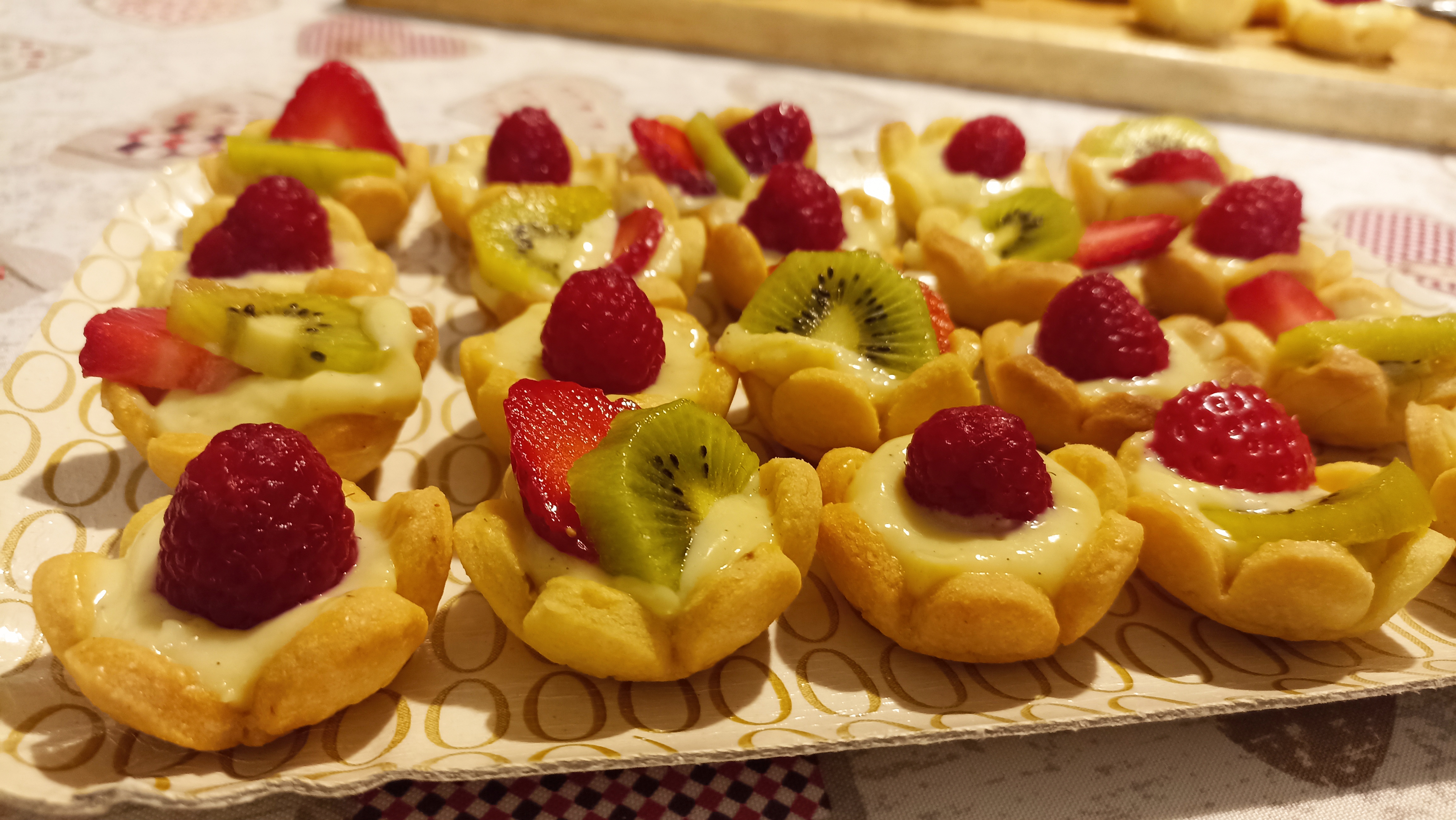 Sfornate e lasciate raffreddare completamente.Nel frattempo lavate, asciugate, sbucciate la frutta e tagliatela a fettine. Togliete i pirottini di carta molto delicatamente e disponete le basi di frolla su un vassoio riempite le tartellette con la crema pasticcera (utilizzate una sac á poche o un cucchiaino).