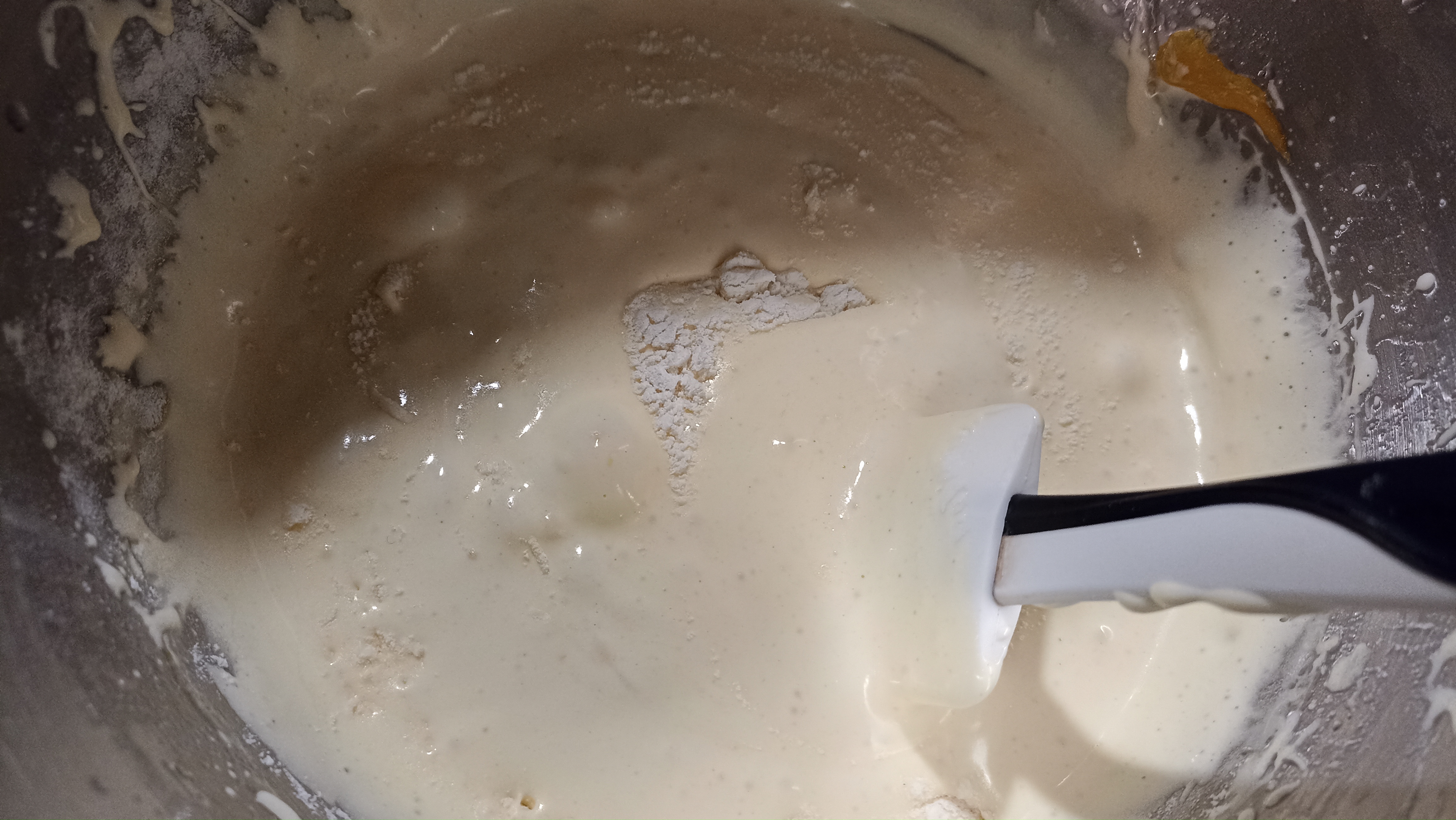 Abbassate la velocità delle fruste e aggiungete a filo l’olio, la farina setacciata con il lievito in 3-4 riprese alternando con il succo d’arancia.