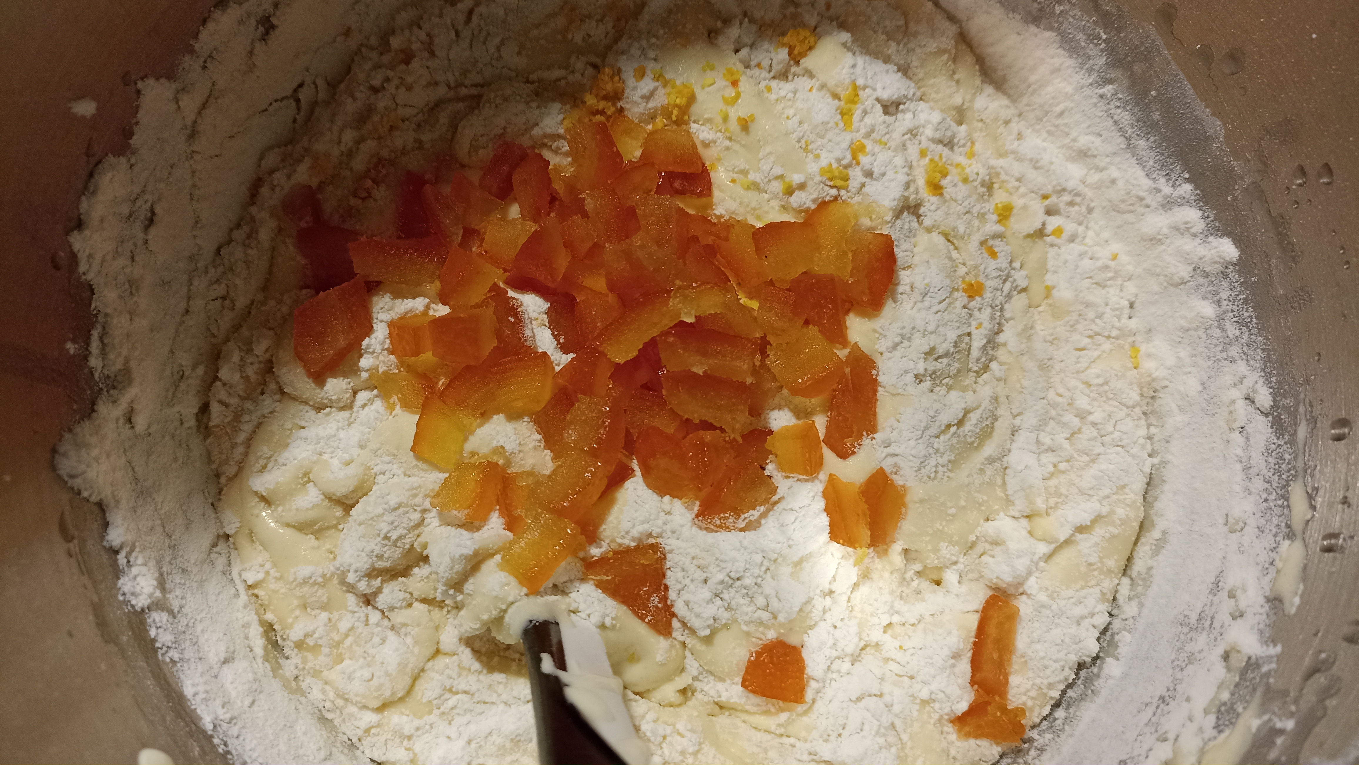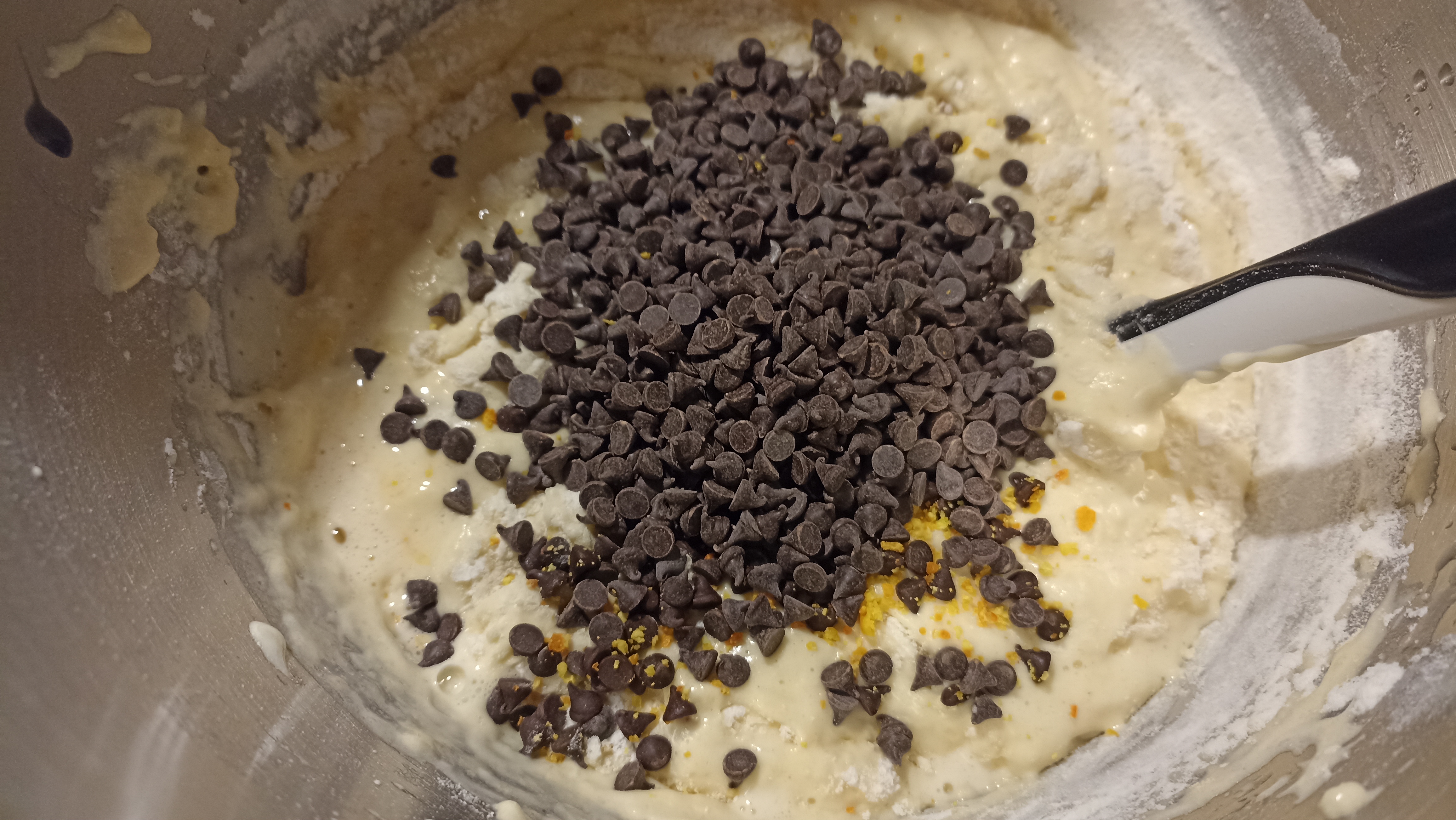 Mescolate delicatamente con una spatola, unite la buccia grattugiata dell’arancia, la fialetta di aroma arancia, la scorza candita tagliata a pezzettini, le gocce di cioccolato, un pizzico di sale e mescolate fino a ottenere un composto omogeneo.