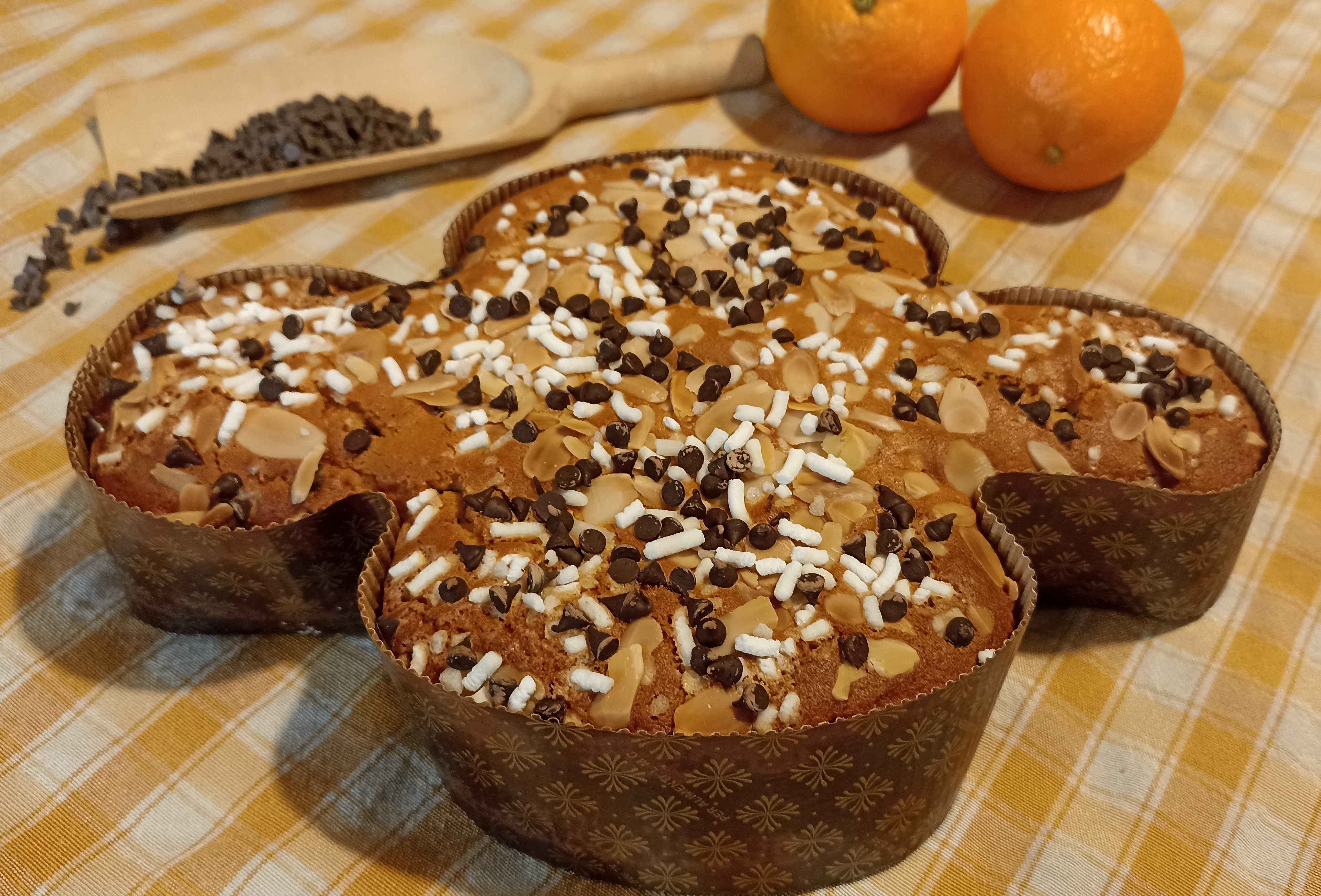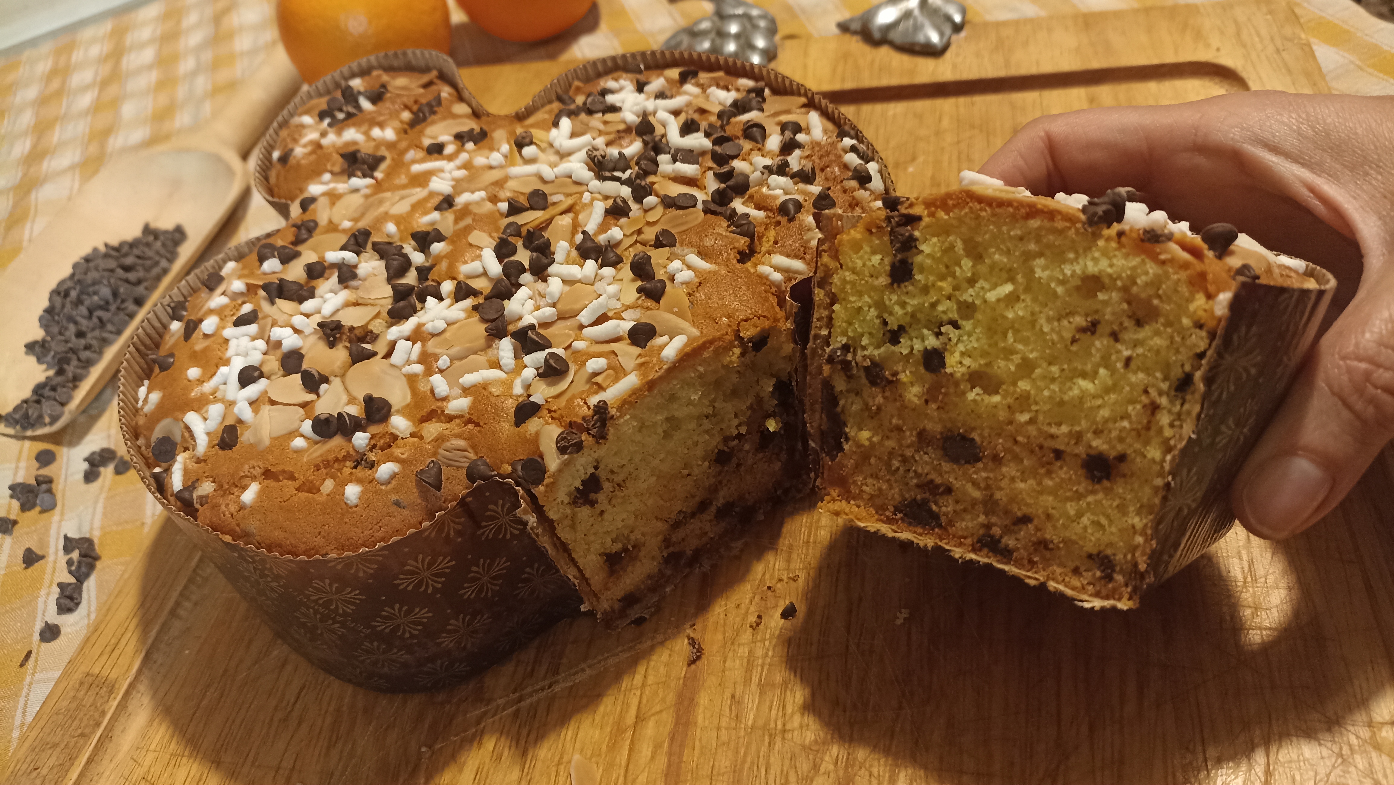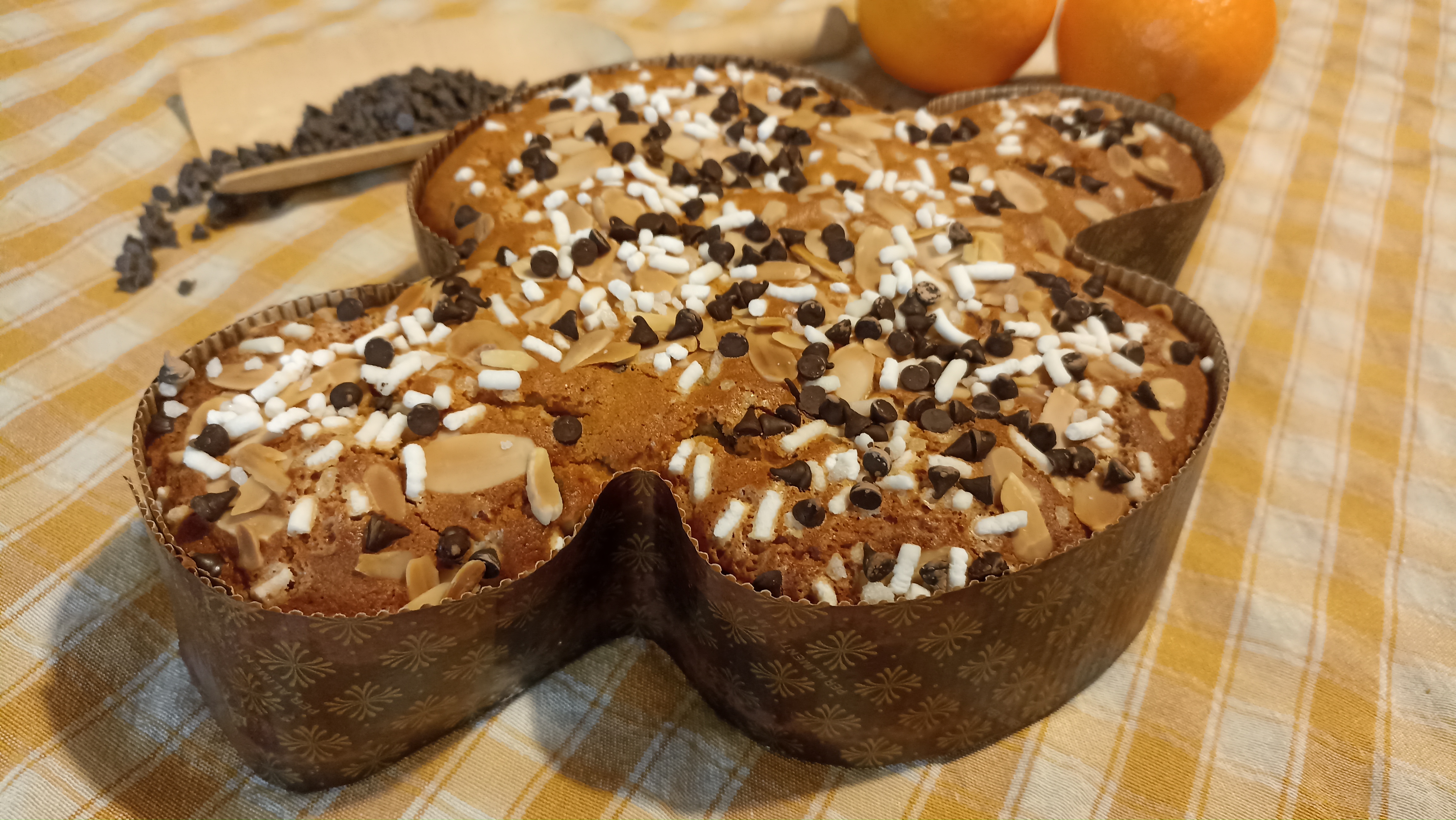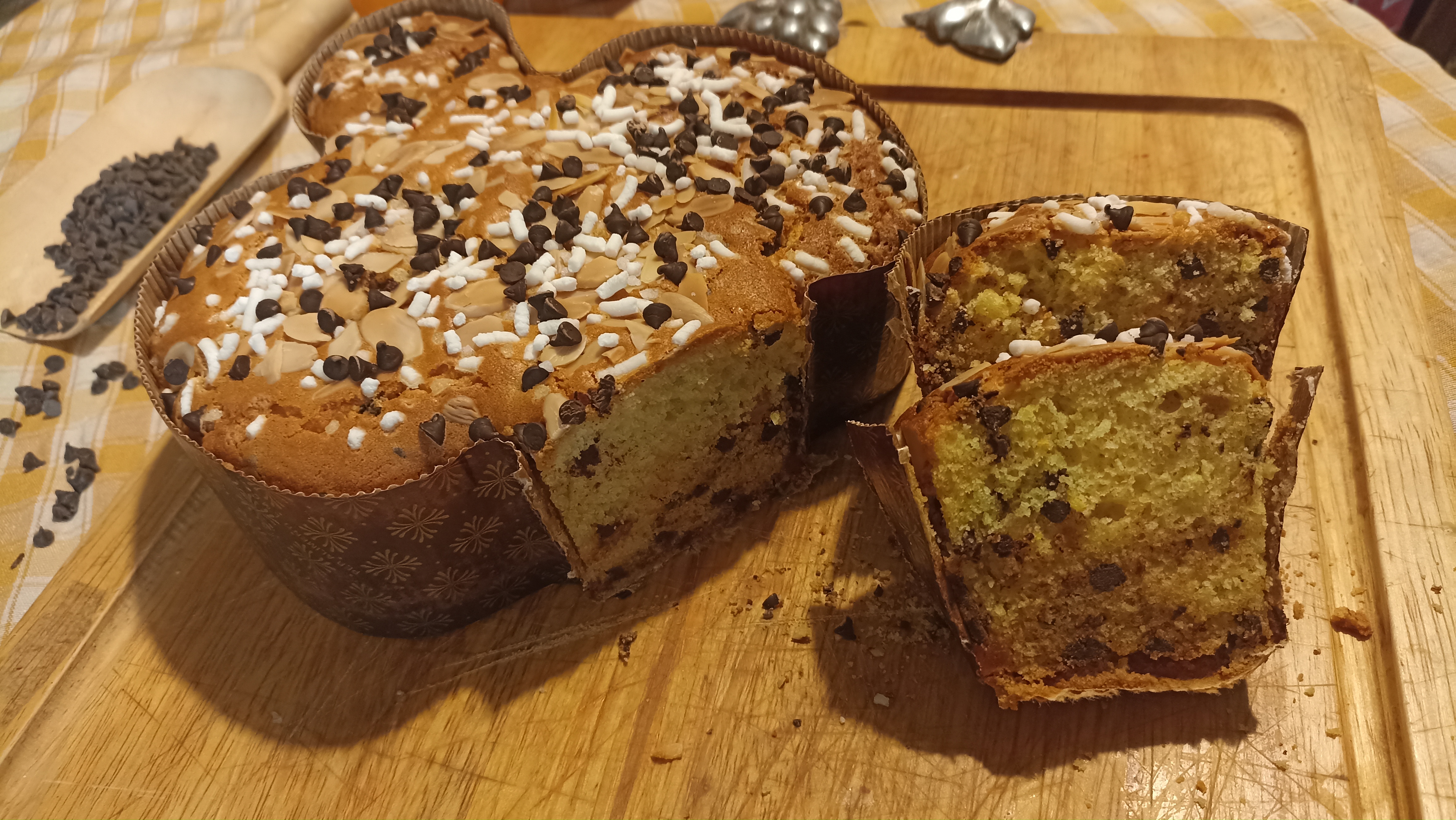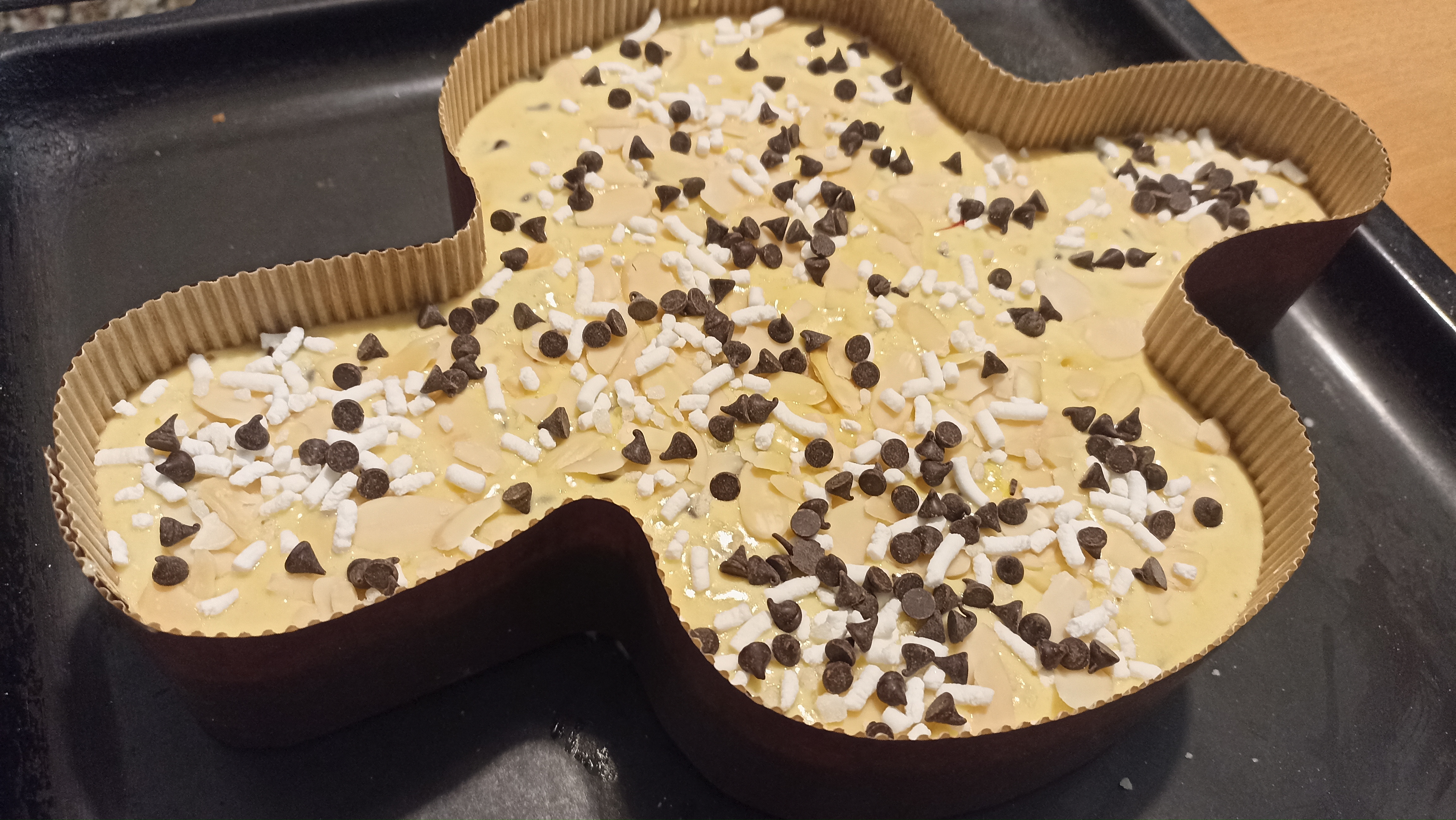 Versate il composto in uno stampo per colomba, cospargete con lamelle di mandorle, zucchero a granella e gocce di cioccolato.