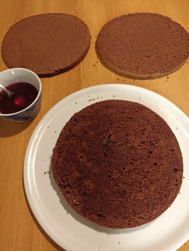 Tagliate il pan di spagna in tre dischi dello stesso spessore, bagnate il primo disco con una parte di bagna.