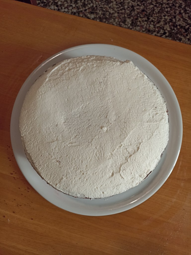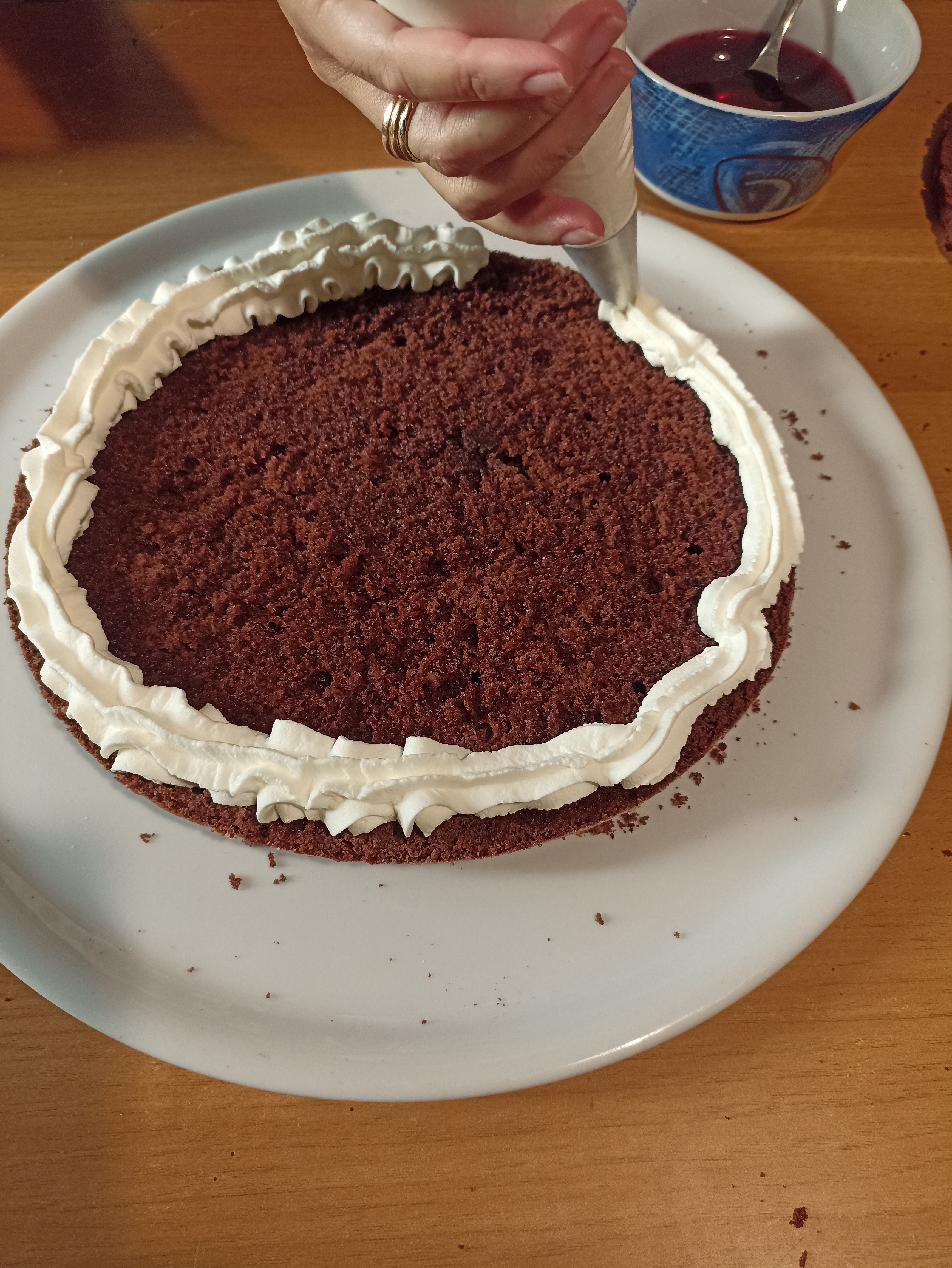 Sovrapponete il secondo disco di pan di spagna, bagnatelo con la bagna e distribuite un’altra parte di panna e di amarene. Coprite con il terzo disco, bagnate e spalmate lo strato superiore e i bordi con il resto della panna, lasciatene una piccola parte per decorare.