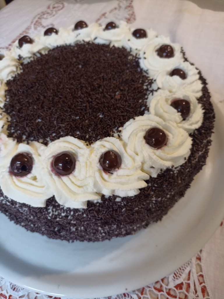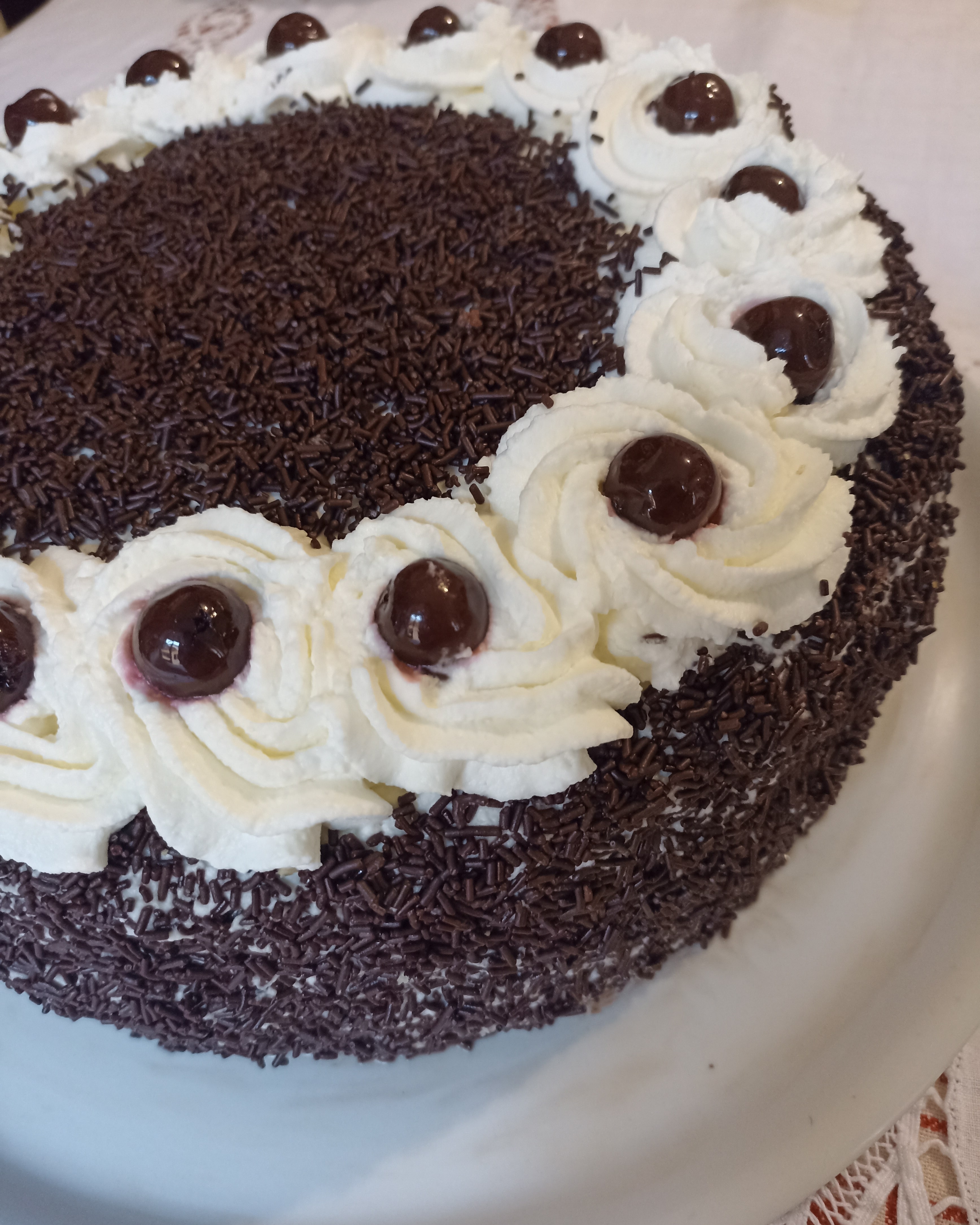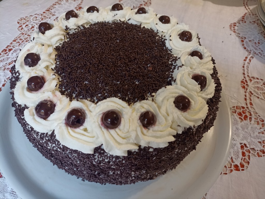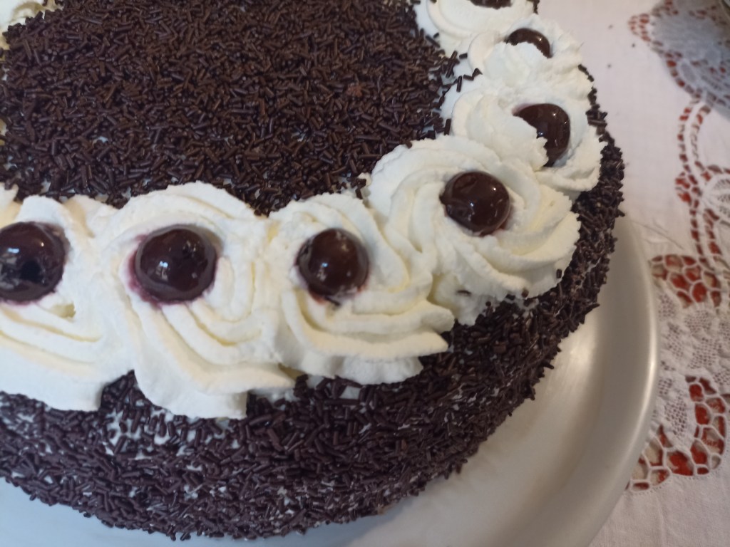 La foresta nera o Schwarzwälder Kirschtort è un dolce tipico tedesco a base di pan di spagna al cacao, panna montata, codette di cioccolato fondente, amarene e liquore Kirsh. L’ho realizzata in occasione della laurea di mio figlio Samuele, io ho raddoppiato le dosi perché alla festa eravamo parecchi tra parenti e amici. La foresta nera oltre ad essere scenografica è buonissima, è piaciuta tantissimo a tutti… applausi a non finire per il dolce e naturalmente anche per il festeggiato! ❤️
