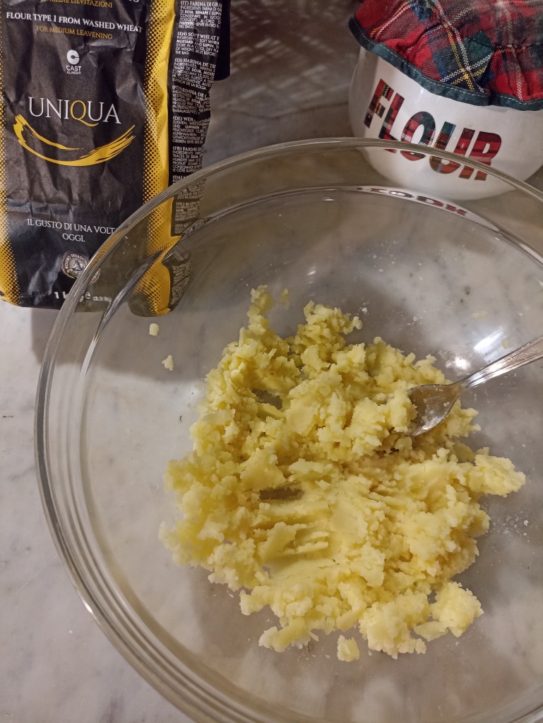 In una ciotola schiacciate le patate lesse e lasciatele raffreddare. Aggiungete quindi la farina e mescolate, al centro fate un incavo e unite il lievito sciolto nell’acqua tiepida insieme allo zucchero, mescolate e iniziate a impastare. Aggiungete l’olio il sale e mescolate ancora un attimo.
