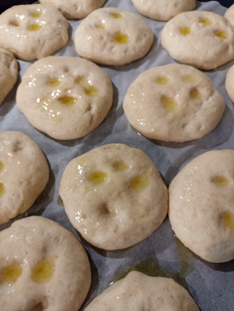 Affondate le dita nelle focaccine per fare i classici buchi e spennellatele con olio.