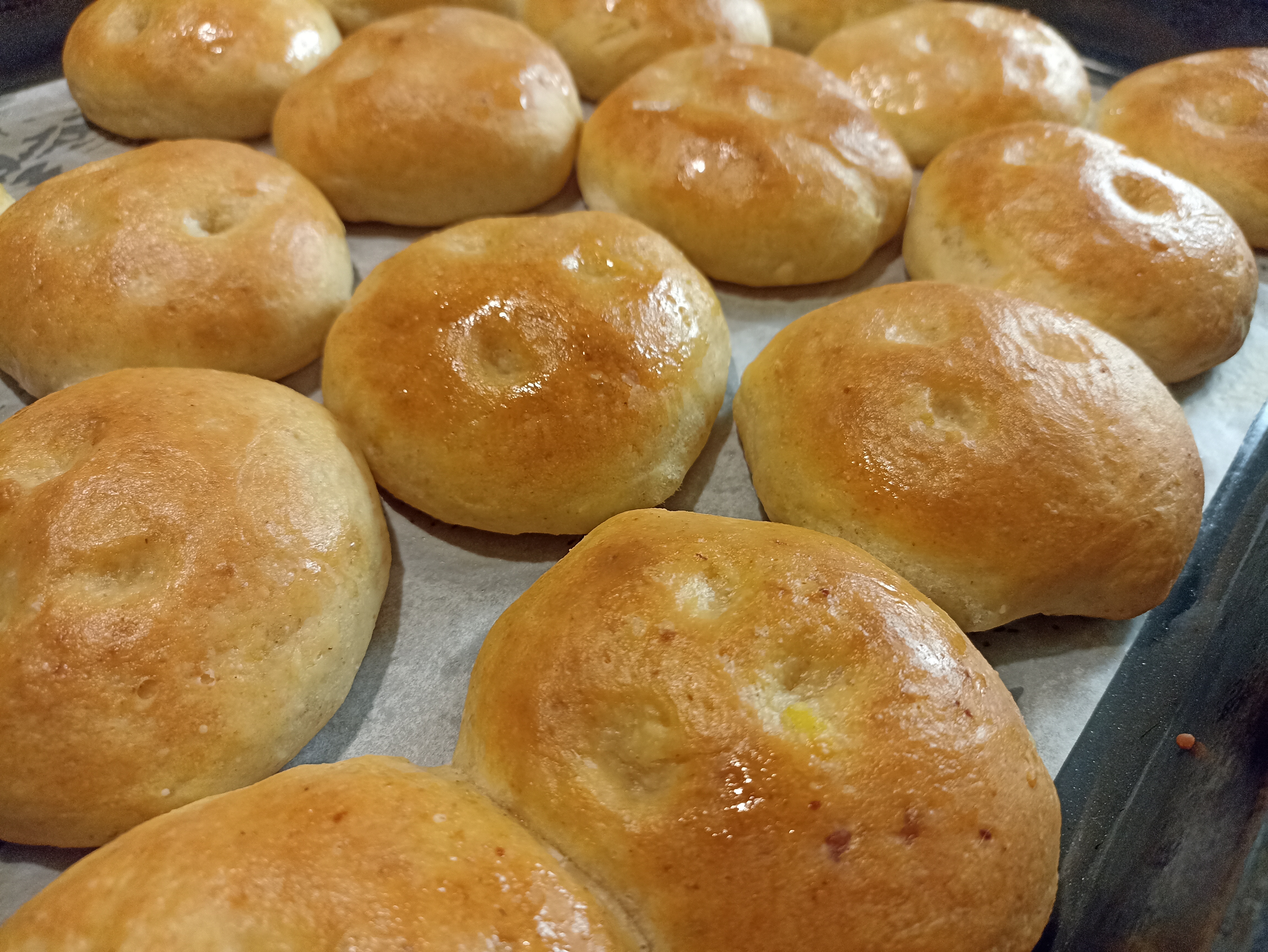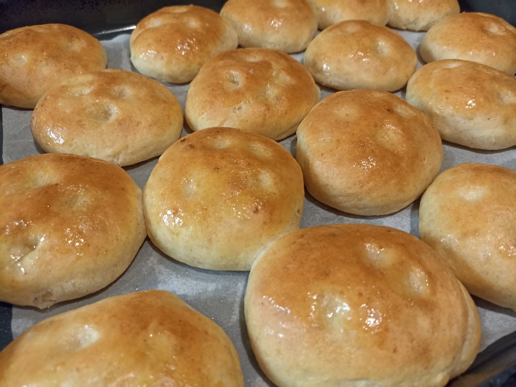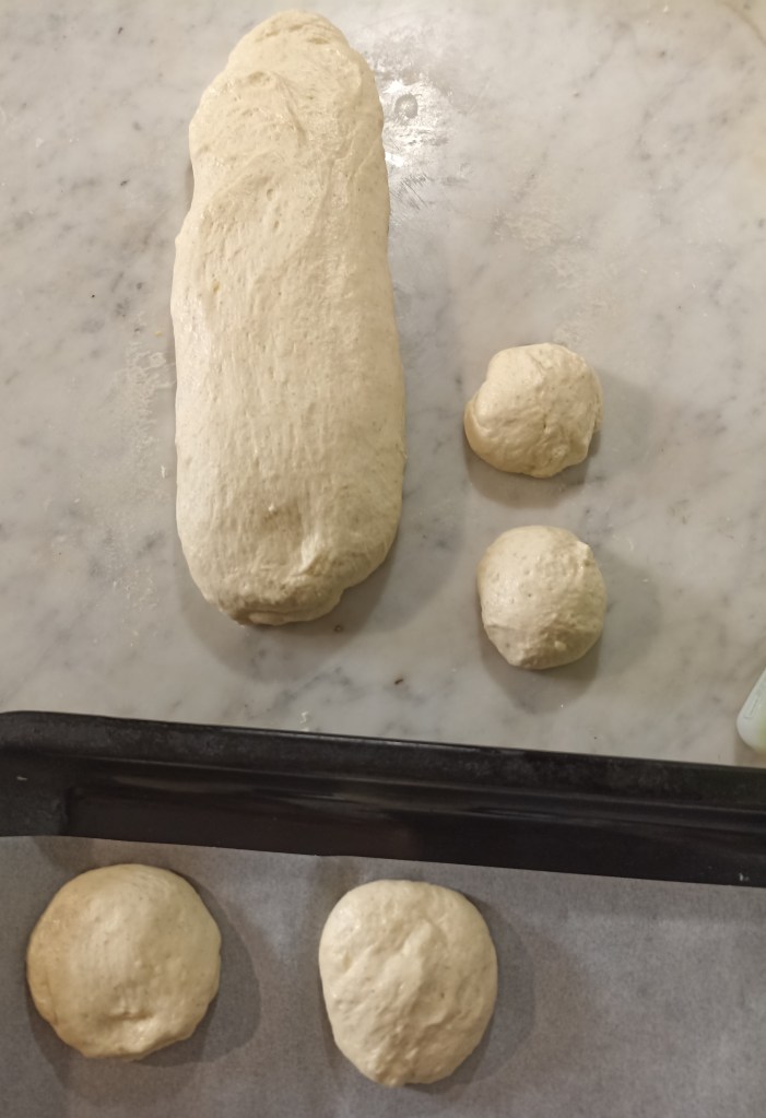 Trascorso il tempo di lievitazione dividete l’impasto, formate delle palline di circa 60 g ciascuna ponetele su una teglia rivestita con carta da forno e lasciate lievitare nuovamente per un’ora.