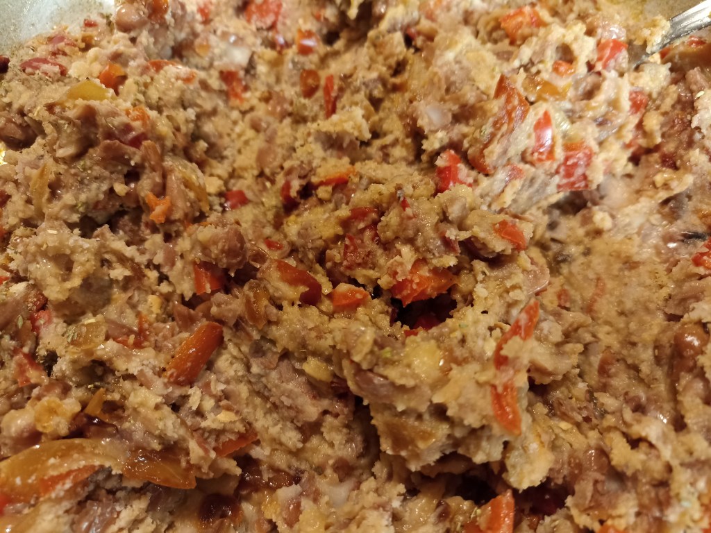 Mettete i fagioli lessi ben sgocciolati in una ciotola e schiacciateli con una forchetta, aggiungete i peperoni tiepidi, il pangrattato, l’uovo, il rosmarino tritato un pizzico di sale e mescolate bene per amalgamare tutti gli ingredienti (dovrete ottenere un composto abbastanza sodo).