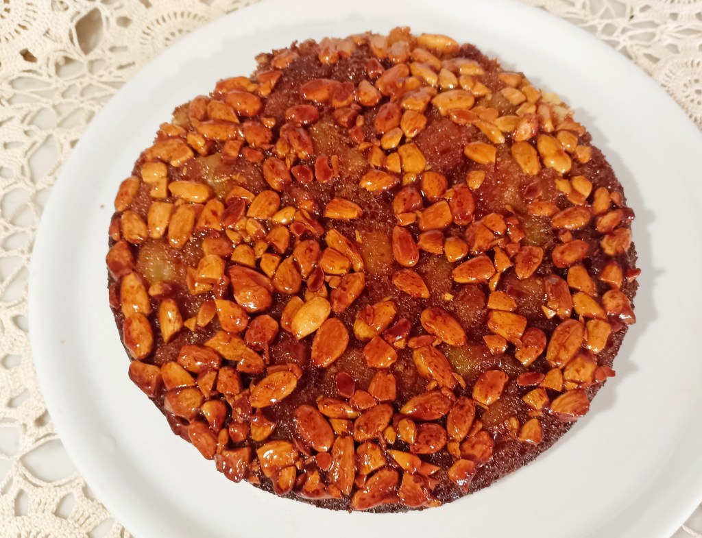 La torta rovesciata al croccante di mandorle è un dolce delizioso: la base è morbida ed è contrastata dalla croccantezza della strato di mandorle caramellate. Alla base ho aggiunto delle pere cotte nel vin santo che conferiscono al dolce un sapore speciale!