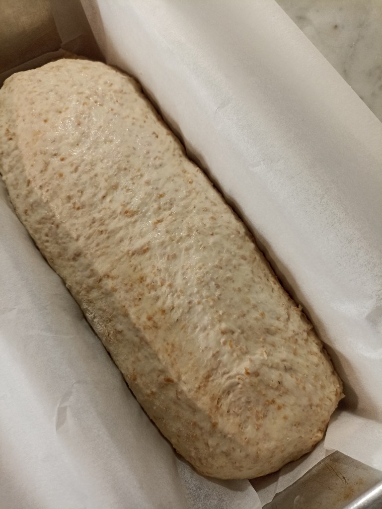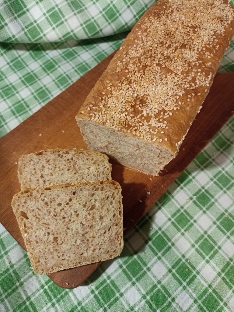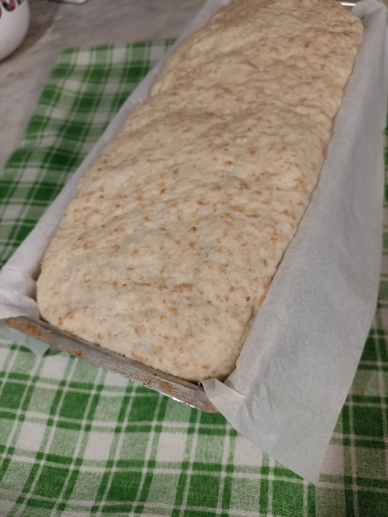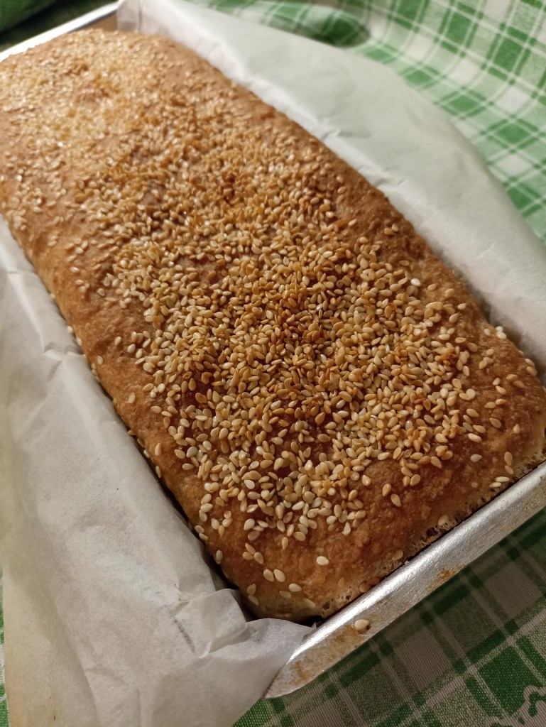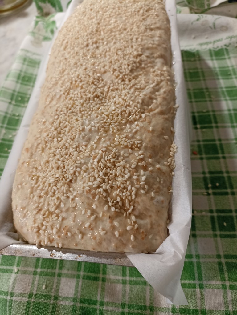 Trasferitelo quindi in una ciotola oleata, coprite con una pellicola e lasciate lievitare per due ore circa, l’impasto deve raddoppiare di volume.Trascorso il tempo di lievitazione ponete l’impasto in uno stampo da plumcake di 30 cm, fate lievitare nuovamente per un’ora, l’impasto deve raggiungere il bordo dello stampo.Spennellate la superficie con acqua e un filo d’olio e cospargete con i semi di sesamo.