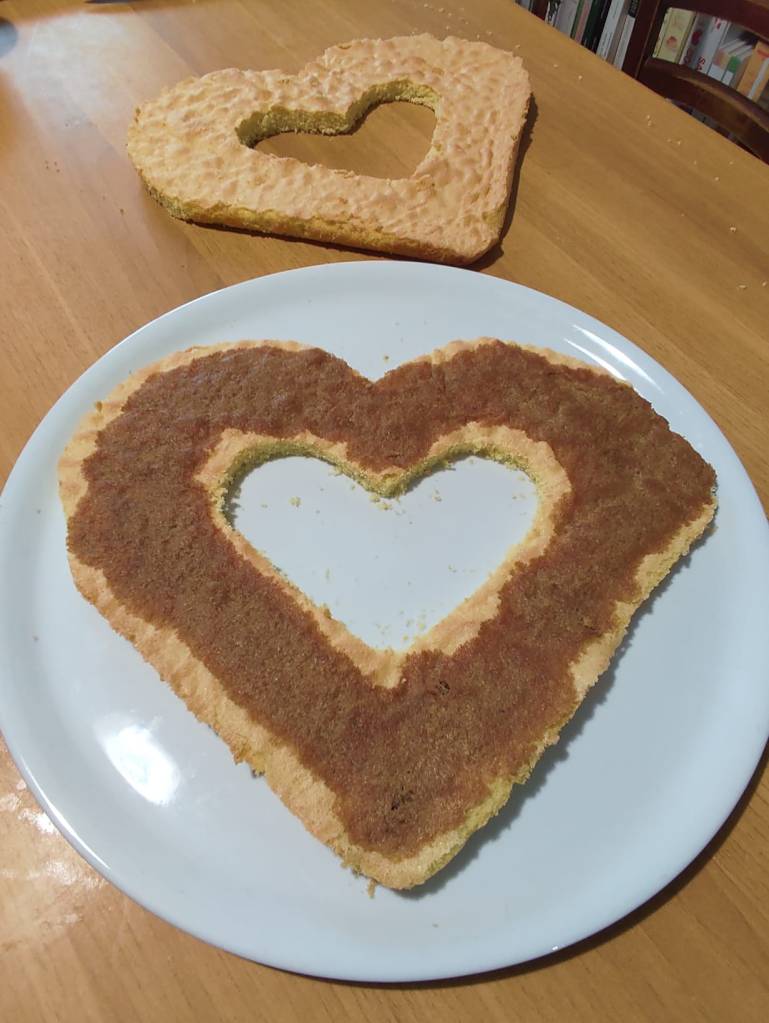 Ponete un cuore su un piatto da portata, bagnate con il caffè (non bagnate il bordo del cuore, altrimenti si ammorbidisce troppo). Lasciatene pochissimo per l’atro cuore.