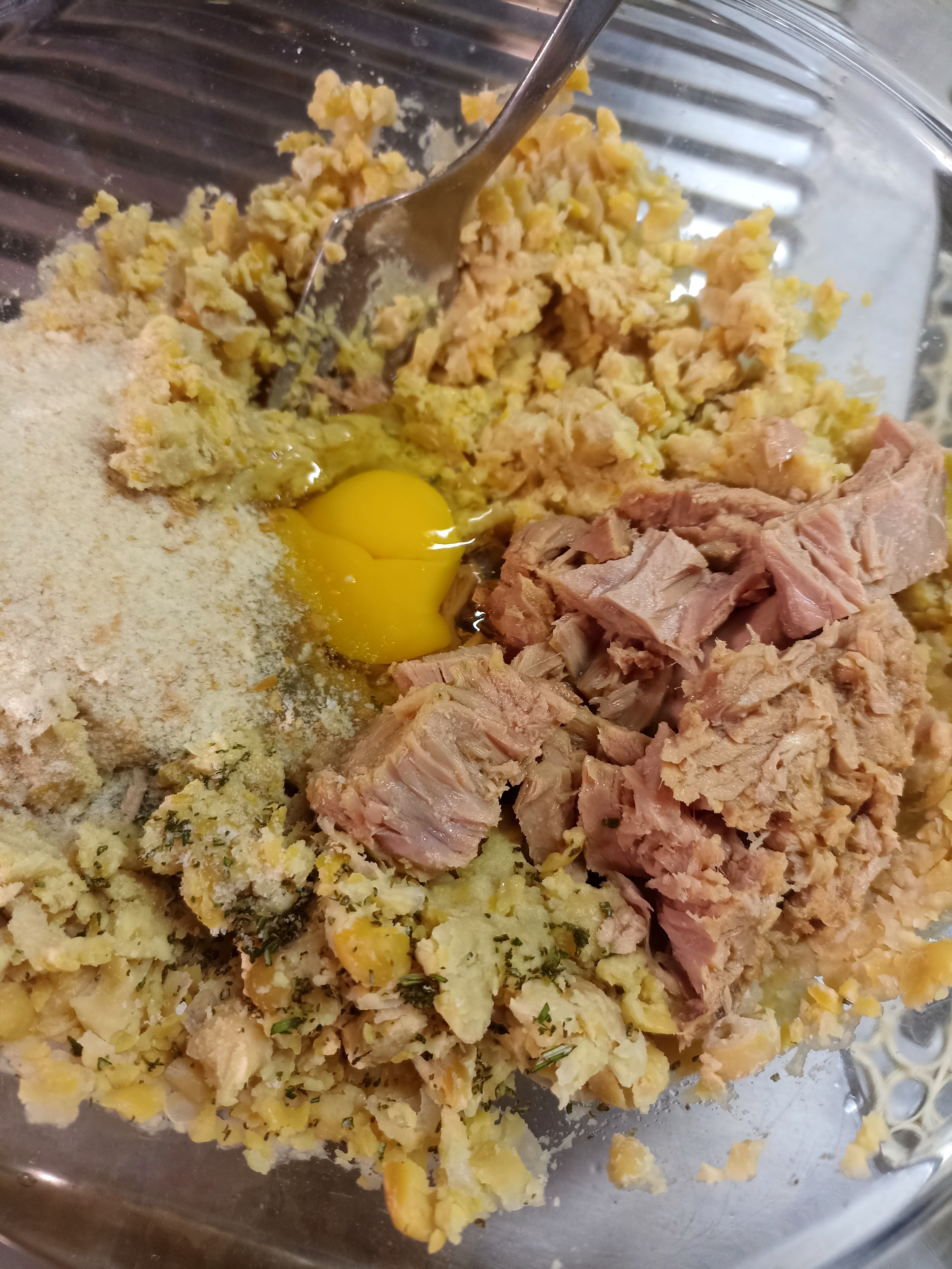 Aggiungete il tonno sgocciolato, l’uovo, la cipolla rosolata, il pangrattato, il rosmarino tritato e aggiustate di sale.