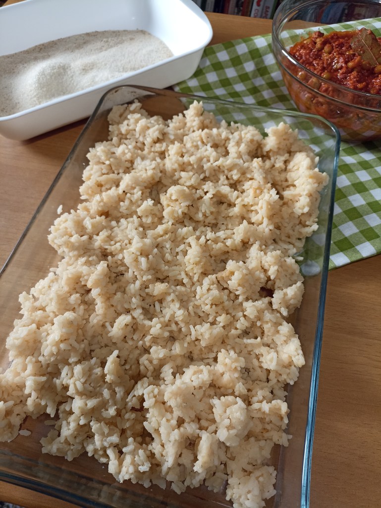 Fate cuocere il riso in acqua bollente salata, scolatelo e aggiungete poi il parmigiano grattugiato e il burro. Mescolate e trasferite il riso in una pirofila per farlo raffreddare.