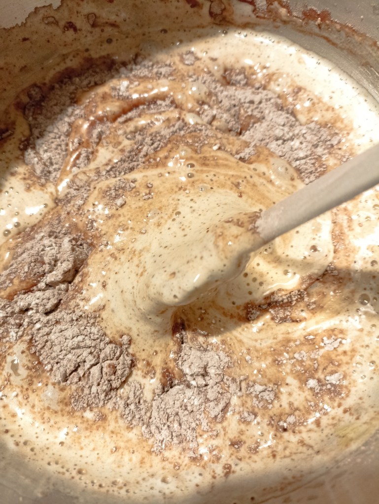 Abbassate la velocità dello sbattitore, versate a filo l’olio, il whisky e il latte. Aggiungete la farina di mandorle, un pizzico di sale e mescolate delicatamente con una spatola. Setacciate sul composto di uova la farina, il cacao, il lievito e mescolate dal basso verso l’alto.