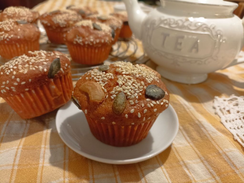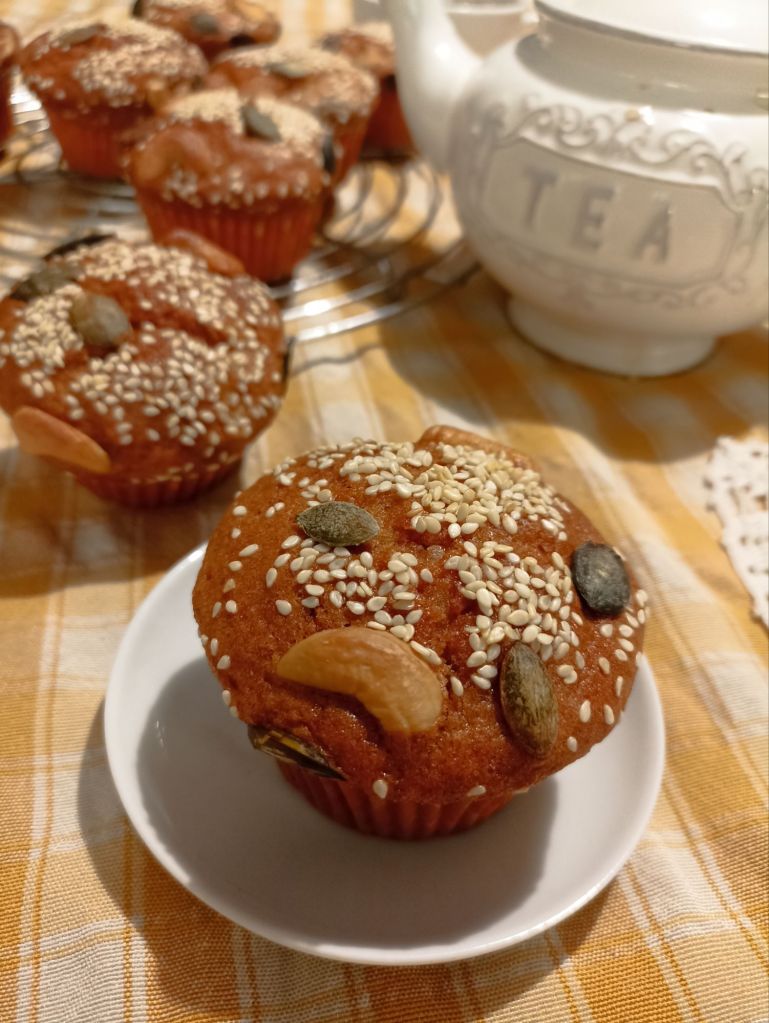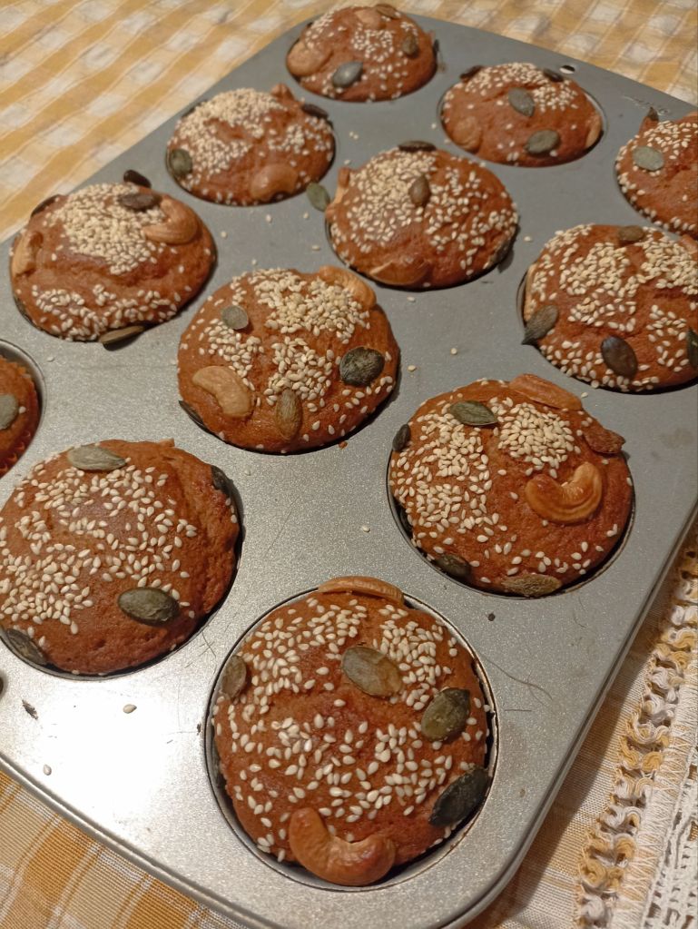 Unite gli ingredienti liquidi a quelli secchi e mescolate con una spatola senza lavorare troppo il composto; deve rimanere piuttosto granuloso.Con un cucchiaio, riempite gli stampini per muffin, cospargeteli con semi di sesamo e semi di zucca. Cuocete in forno statico preriscaldato a 180°C per 25 minuti. Per verificare la cottura, fate sempre la prova dello stecchino, deve risultare asciutto.