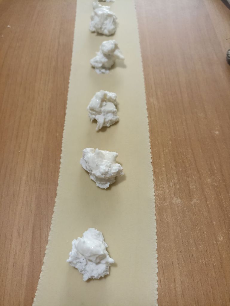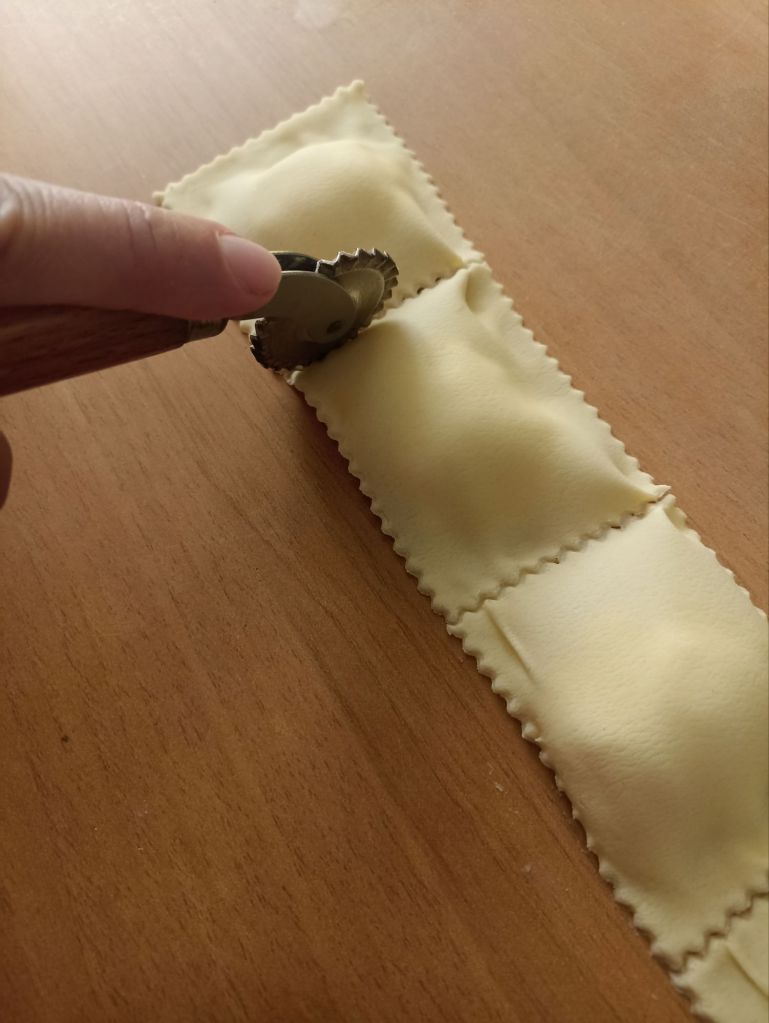 Sopra ciascuna sfoglia mettete un cucchiaino di ripieno e un cucchiaino di crescenza, coprite con la sfoglia, sigillate bene e con la rotella ritagliate i ravioli.