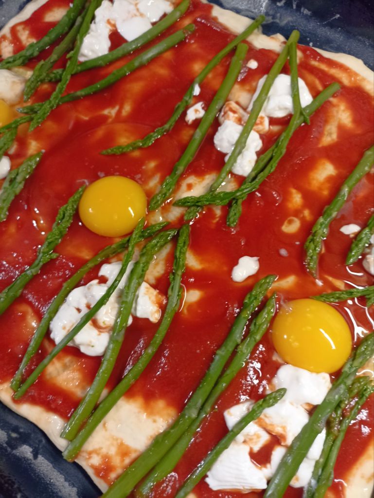 A quanto punto distribuite sopra metà passata di pomodoro, un pizzico di sale, una mozzarella a dadini, le uova crude, alcune punte di asparagi e un filo d’olio.