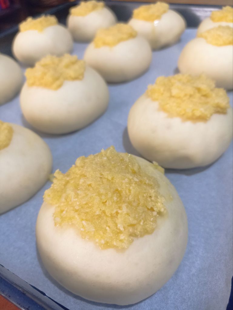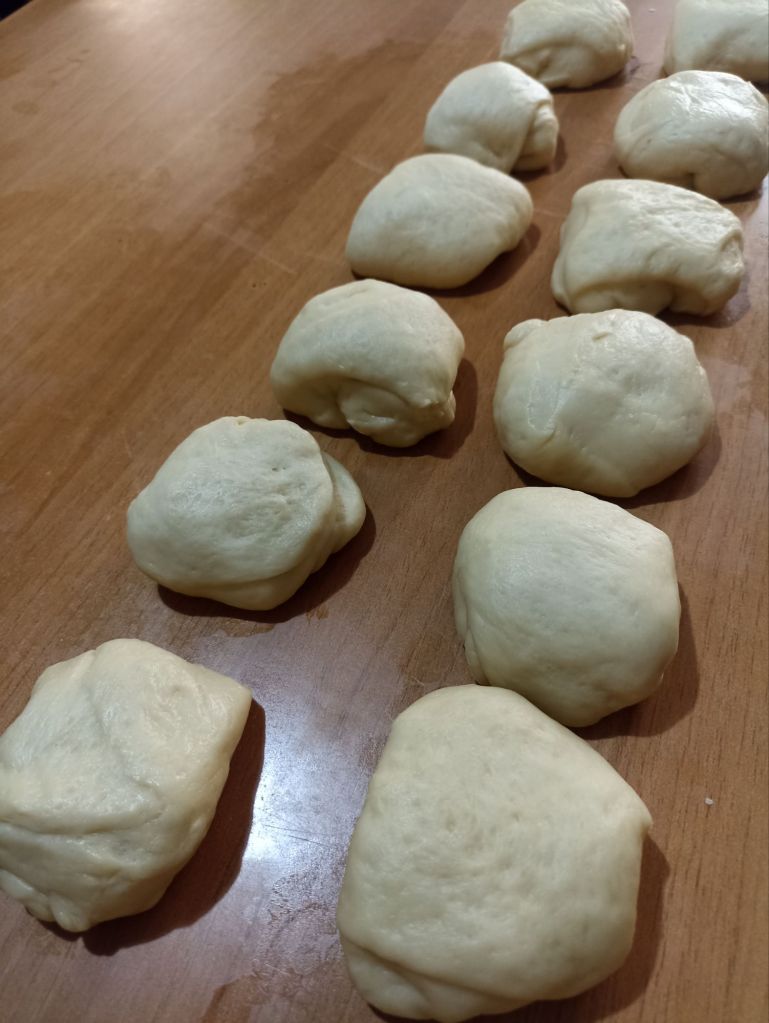 Lasciate lievitare finché l’impasto non raddoppia di volume, due ore circa (nel forno con la lucina accesa). Trascorso il tempo di lievitazione, dividete l’impasto in 12 parti di circa 75 grammi ciascuna, create delle palline, ponetele su una teglia rivestita con carta da forno e lasciate lievitare per un’ora (nel forno con la lucina accesa).