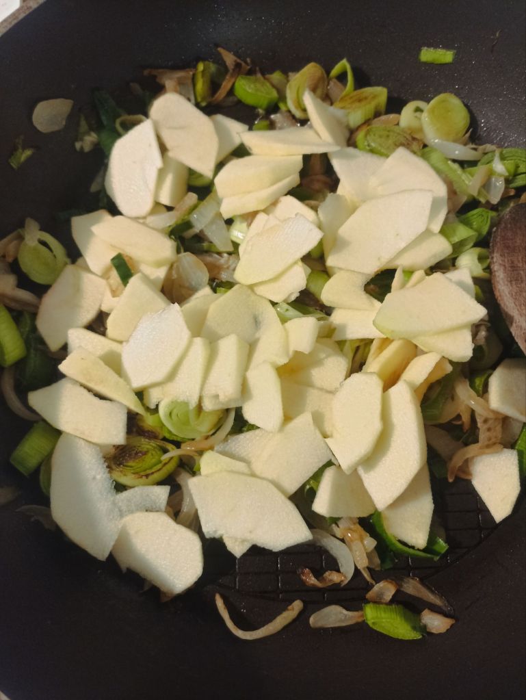 In una padella fate rosolare nel burro la cipolla affettata sottilmente insieme al porro, poi aggiungete le patate tagliate a fettine sottili.
