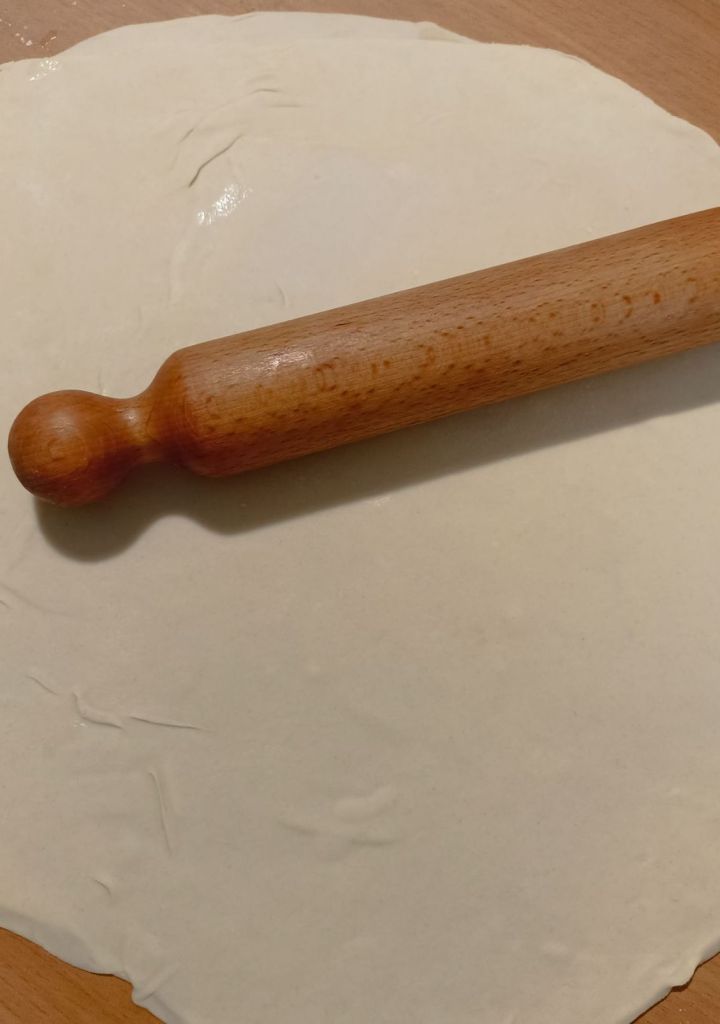Stendete quindi la sfoglia più piccola, coprite la torta e richiudete il bordo.
