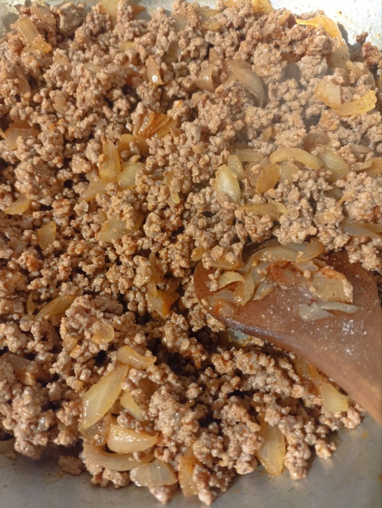 In una padella fate rosolare in due cucchiai d’olio la cipolla affettata sottilmente, aggiungete quindi la carne macinata, un pizzico di sale, una spolverata di pepe e la paprika.