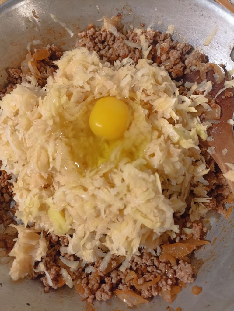 Sbucciate le patate, lavatele e grattugiatele con una grattugia a fori larghi. Strizzate le patate grattugiate e aggiungetele alla carne macinata, unite l’uovo, aggiustate di sale e con un cucchiaio mescolate il tutto.