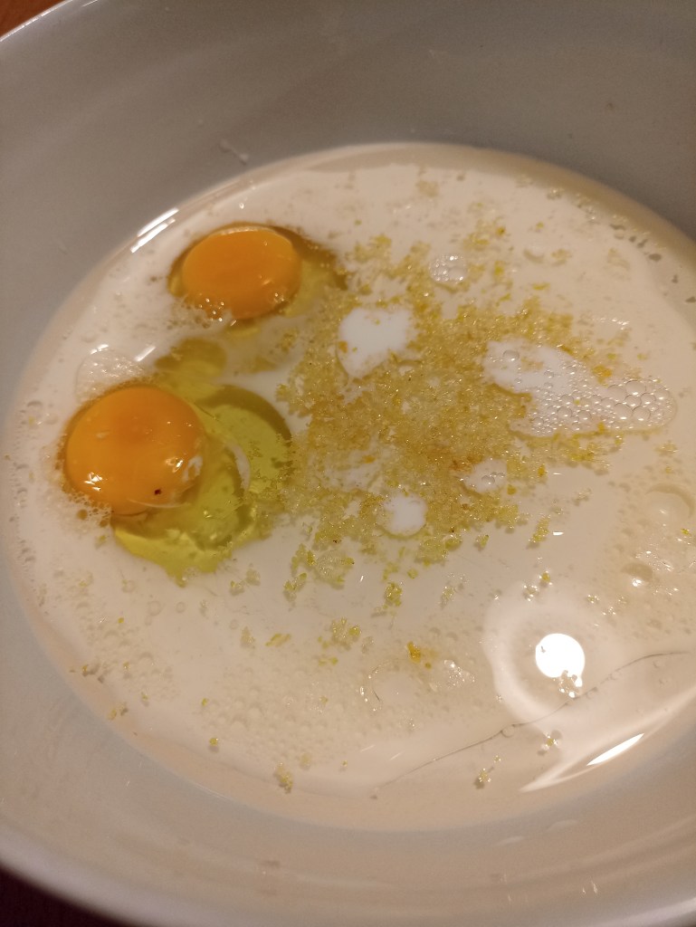 In una ciotola mettete le uova, il latte, l’olio, la buccia grattugiata del limone e mescolate con una frusta a mano.