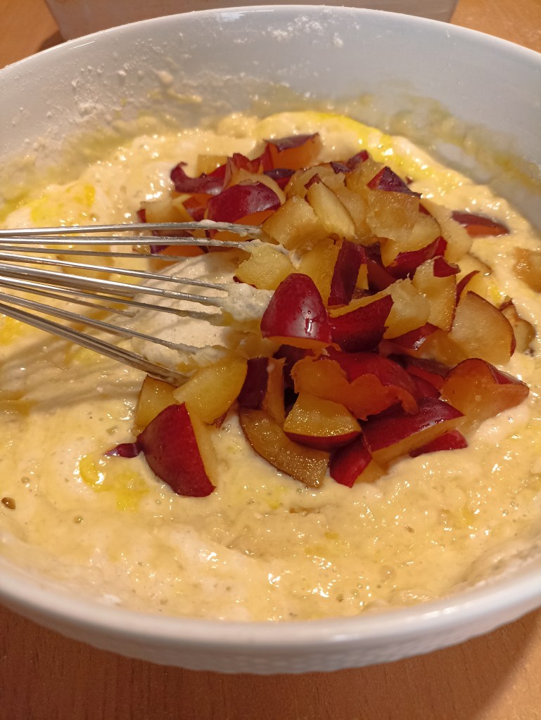 Aggiungere le prugne lavate, denocciolate tagliate a pezzetti e mescolate (lasciate due prugne per decorare).