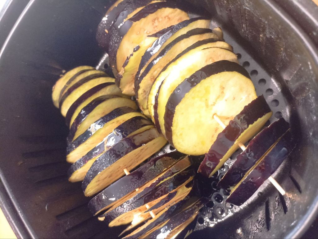 Se non avete la friggitrice ad aria potete cucinare le melanzane in forno a 180° per 15-20 minuti (sfornate quando sono dorate).