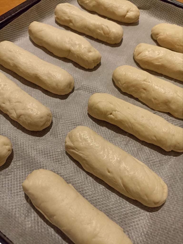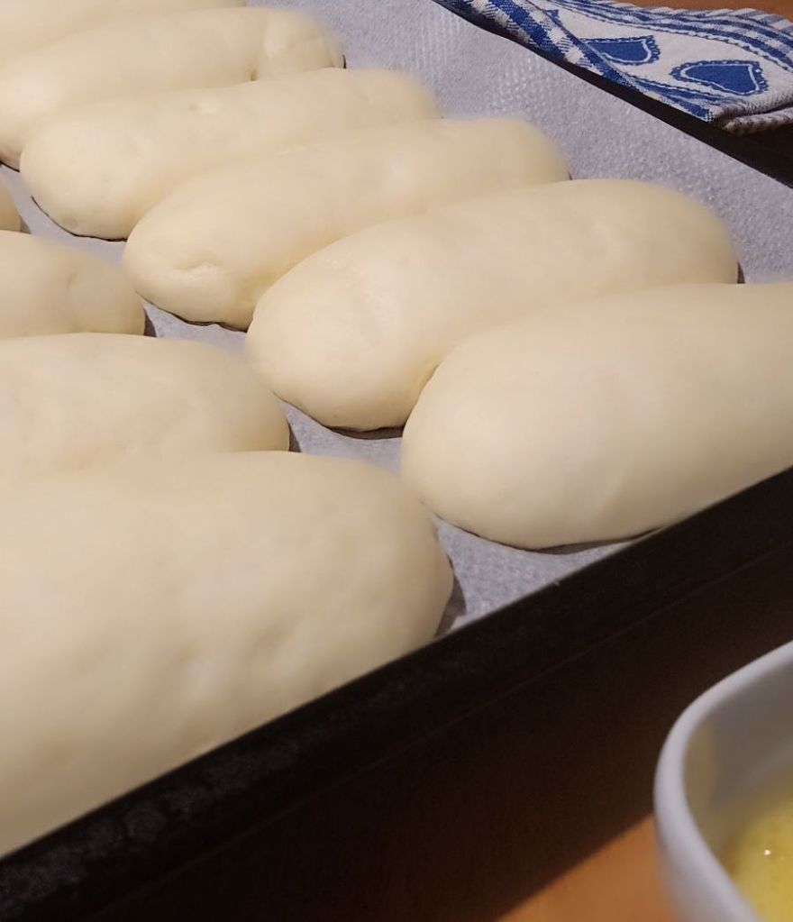 Poneteli in una teglia rettangolare rivestita con carta da forno e lasciate lievitare per un’ora e 15 minuti (i panini devono risultare attaccati uno vicino all’altro).
