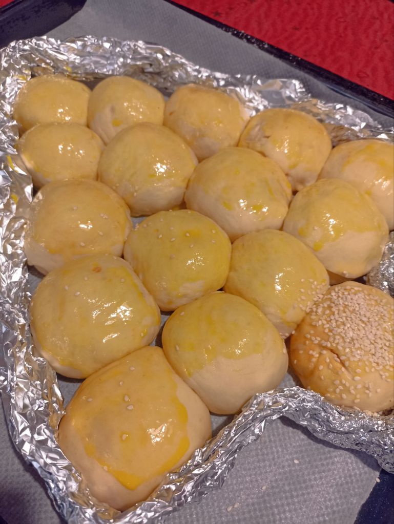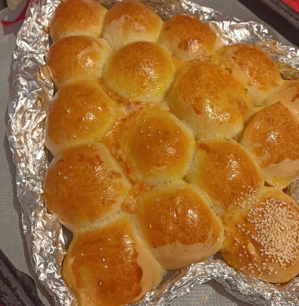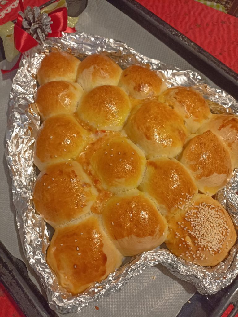 Lasciate lievitare ancora 35-40 minuti, spennellate delicatamente con l’uovo e mettete un po’ di semi di sesamo sul ”tronco” dell’ alberello.