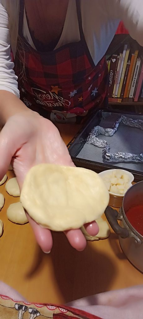 Allargate con le mani (formate un cerchietto) e farcite con un cucchiaio di sugo e provola alternando la farcitura con sugo, acciughe e pecorino chiudete, (sigillate bene la parte chiusa che metterete sotto) e con le mani date la forma sferica. Farcite abbondantemente per evitare che i panini restino asciutti.