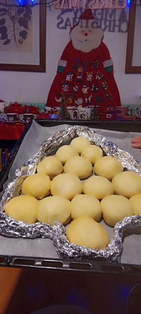Ponete su una teglia grande rivestita con carta da forno le palline sistemandole a forma di alberello ( vedi foto, io ho fatto una sagoma con la carta di alluminio).