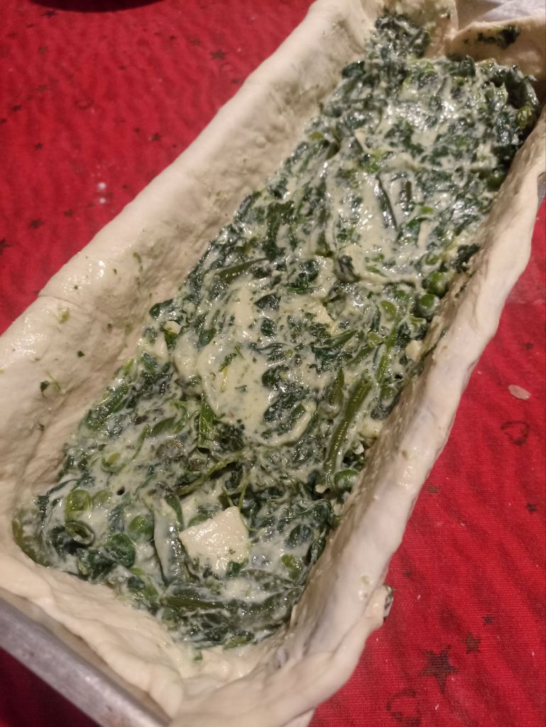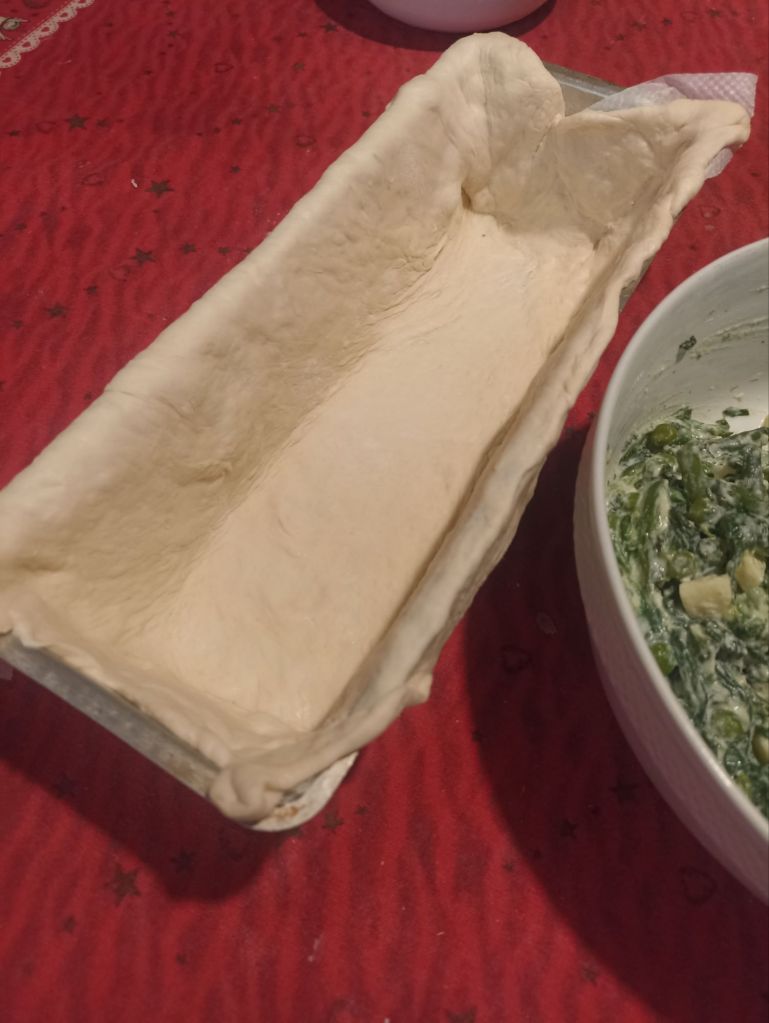 Stendete l’impasto su un foglio di carta da forno, formate un rettangolo cm 38 x 30 circa e rivestite uno stampo da plumcake da 30 cm.