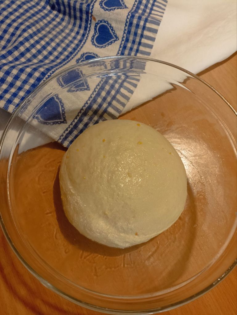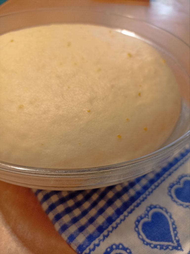 In una ciotola o nella planetaria mettete la farina, al centro aggiungete lo zucchero, l’acqua e il latte tiepidi con il lievito sciolto insieme al miele, l’olio, l’uovo, la buccia grattugiata dell’arancia e i semini di vaniglia.
