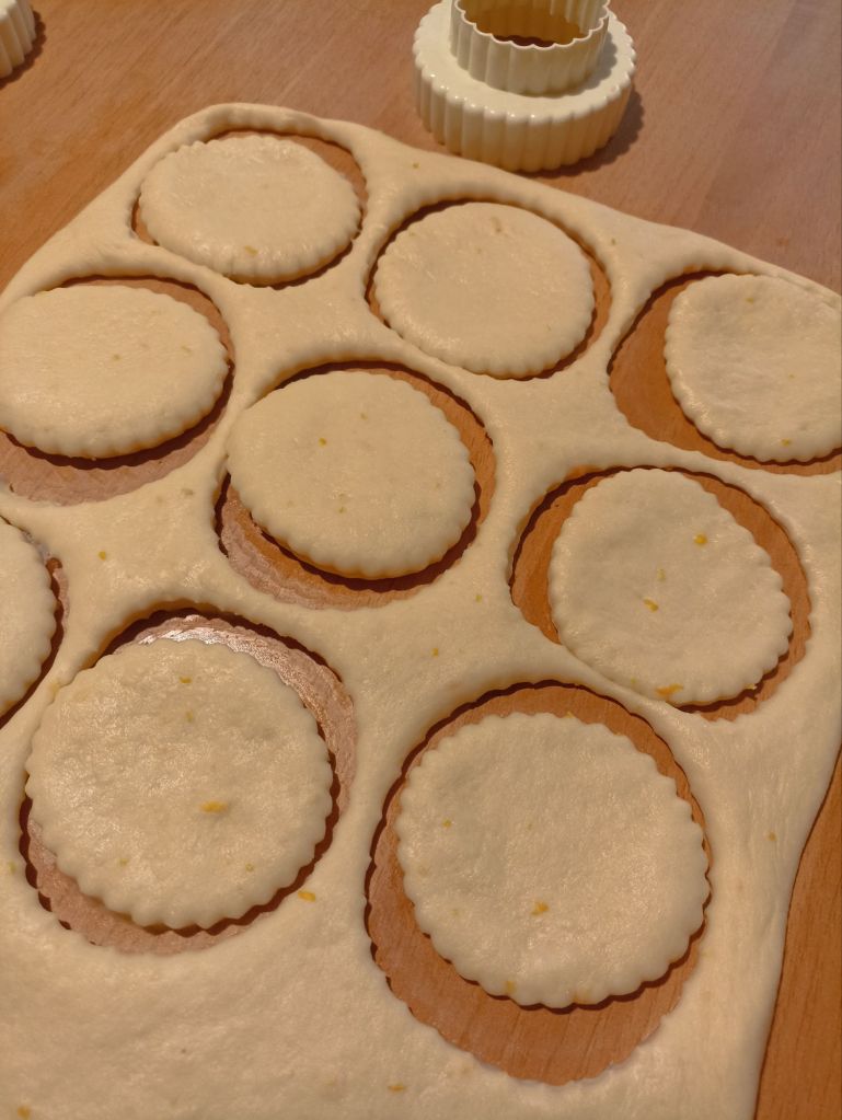 Al centro di ciascuno mettete un cucchiaio di confettura. Stendete nuovamente l’impasto rimasto e ricavate altrettanti dischetti forandoli al centro con un taglia biscotti di diametro più piccolo.
