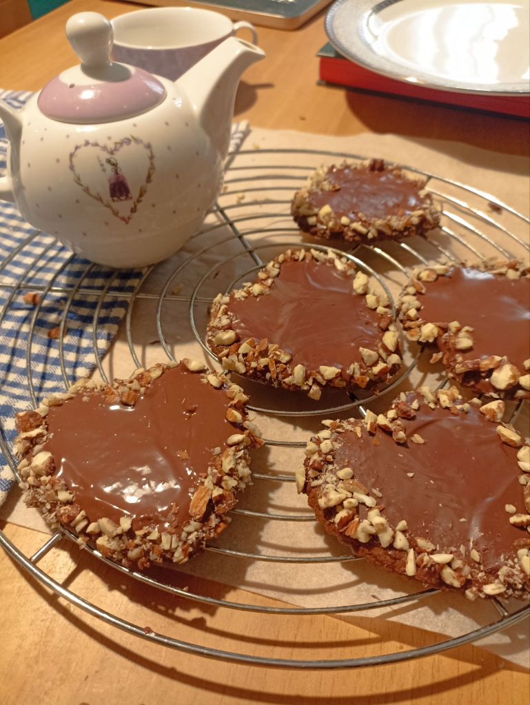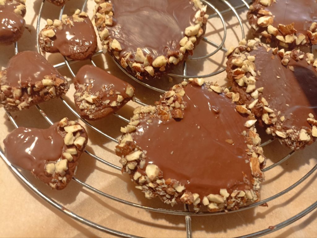 Fate fondere il cioccolato a bagnomaria, immergete il biscotto nel cioccolato fuso (solo da una parte) e decorate i bordi con la granella di nocciole. Mettete i cuori su una gratella per fare solidificare il cioccolato.