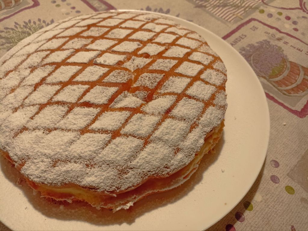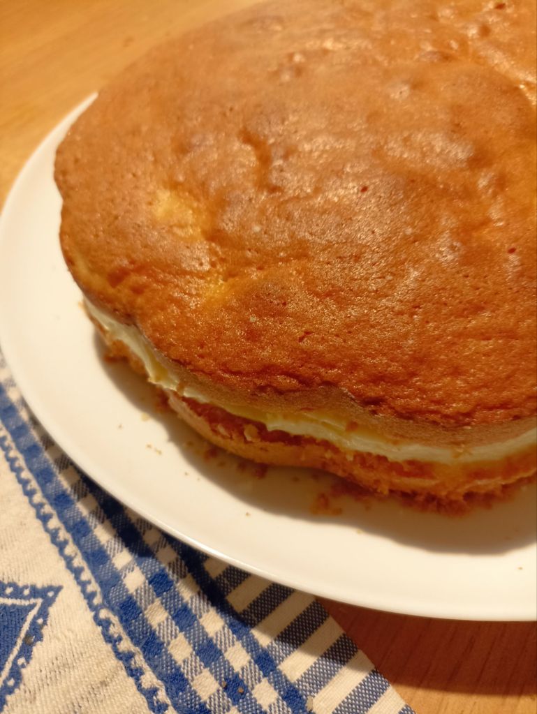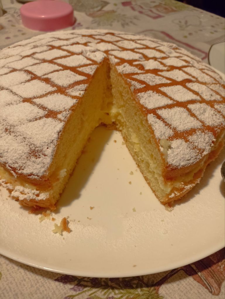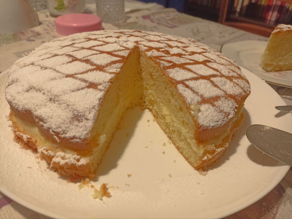 Sfornate la torta, lasciatela raffreddare e trasferitela su un piatto da portata. Tagliate la torta a metà bagnate la base con il latte. Versate la crema e con una spatola distribuitela sulla superficie. Ponete sopra il secondo disco e cospargete con zucchero a velo.