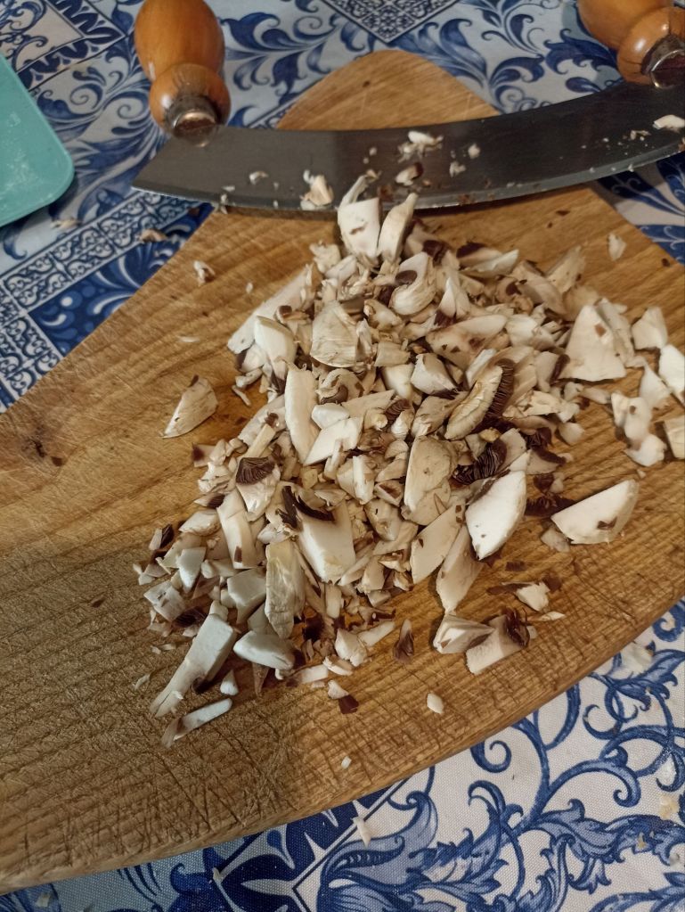 In una piccola casseruola, fate rosolare la cipolla affettata sottilmente e i funghi tritati nel burro per 2-3 minuti.