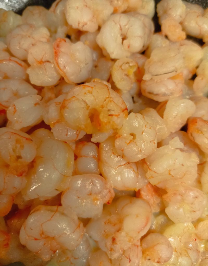 In una padella con due cucchiai d’olio fate rosolare bene la cipolla tritata, aggiungete i gamberetti, che avrete precedentemente scongelato, sciacquato e sgocciolato molto bene (questo passaggio è fondamentale per evitare che rilascino troppa acqua in cottura. Salate e fate insaporire per 4-5 minuti. Lasciate quindi intiepidire
