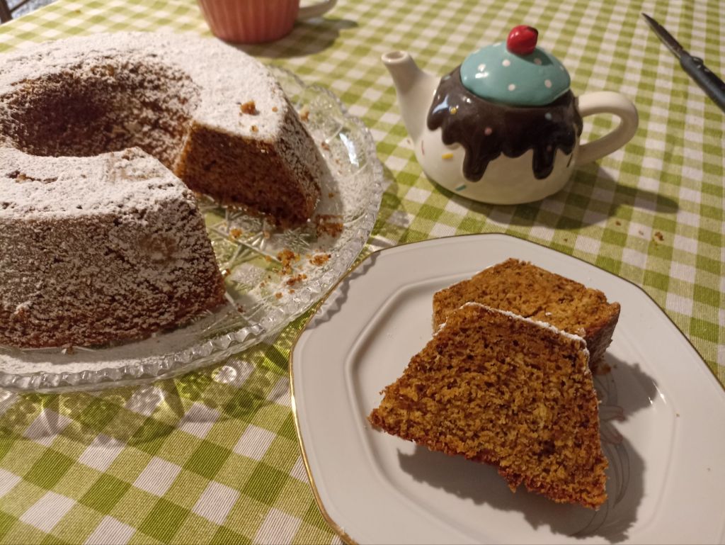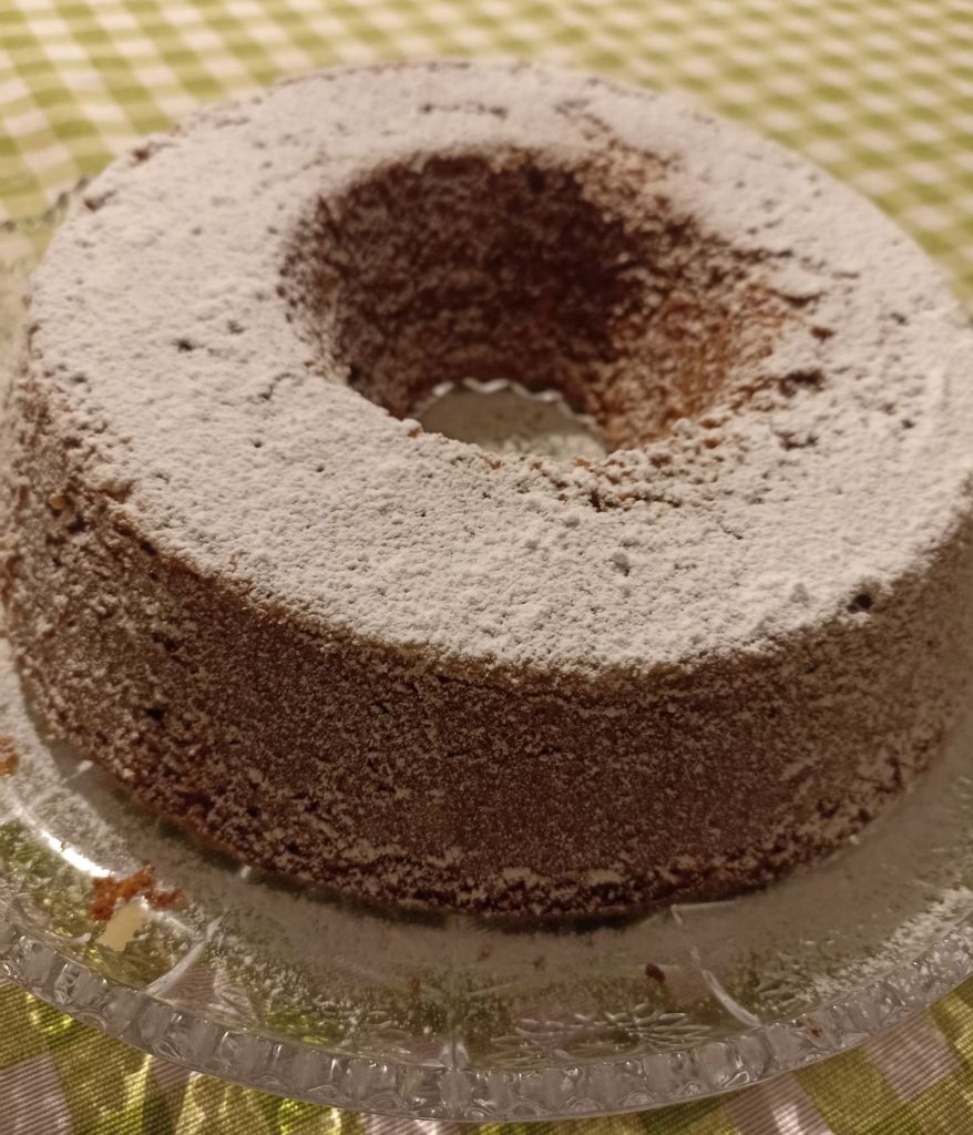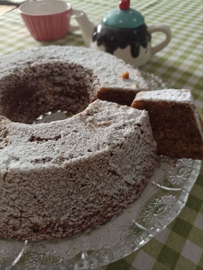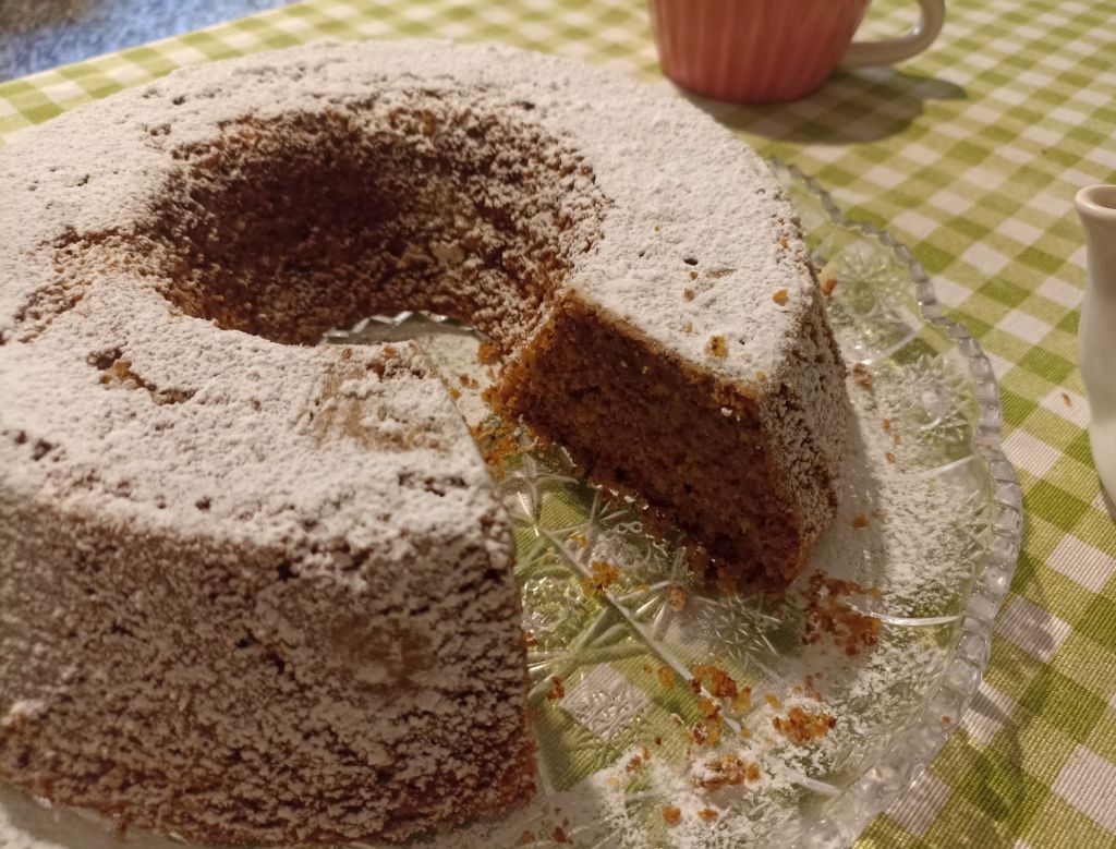 Sfornate, lasciate raffreddare e trasferite la ciambella di carote e noci su un piatto da portata. Cospargete con abbondante zucchero a velo.