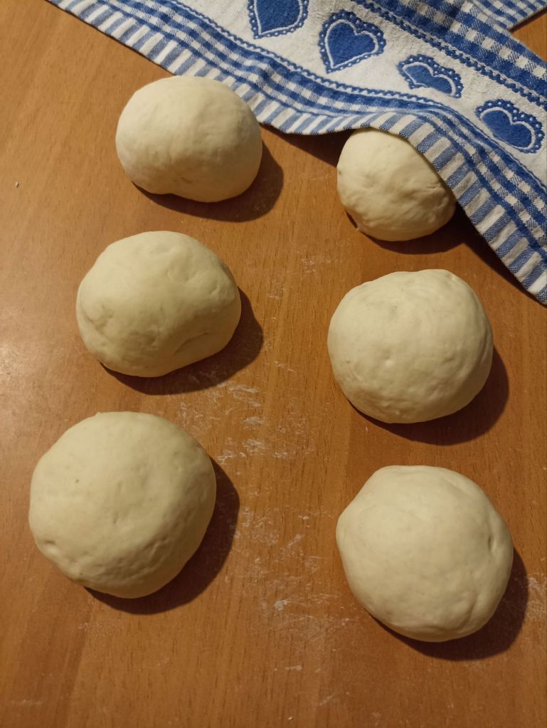 Coprite l’impasto con un canovaccio pulito e fatelo riposare per 10 minuti. Riprendete l’impasto e lavoratelo per 2-3 minuti, dividetelo in 6 palline, copritele e lasciatele lievitare per 30 minuti.