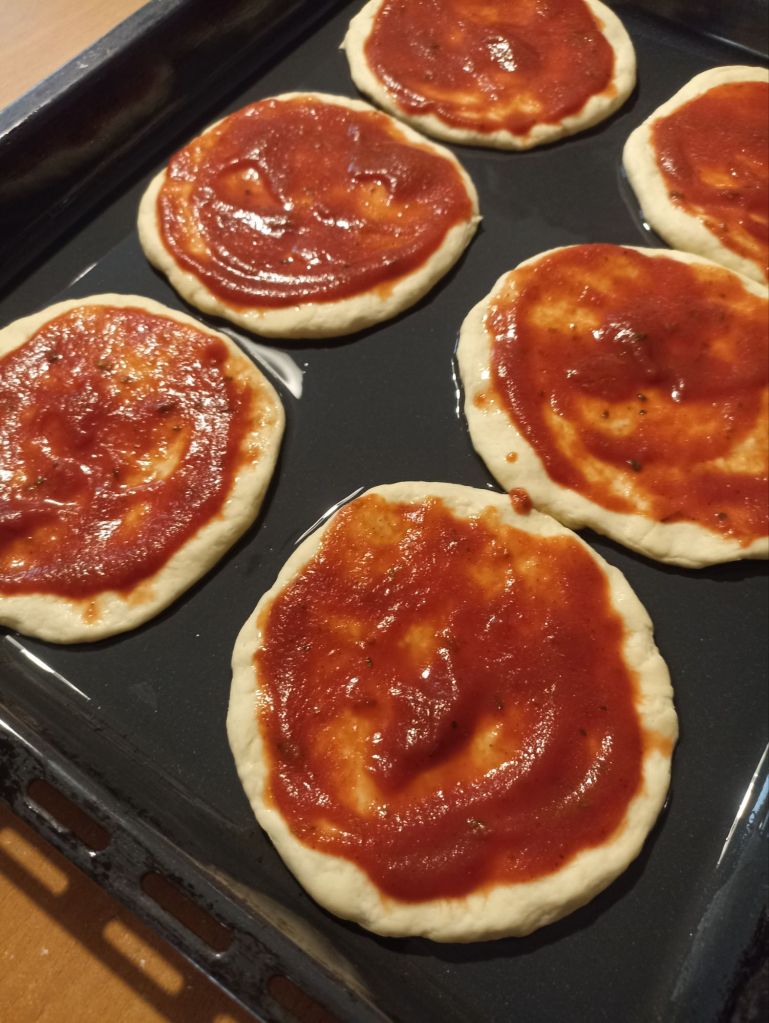 Proseguite allo stesso modo con il resto delle palline. Quando avrete preparato tutte le pizzette, mettete su ciascuna un cucchiaio abbondante di passata di pomodoro, che avrete precedentemente condita con olio, sale, paprika e origano.