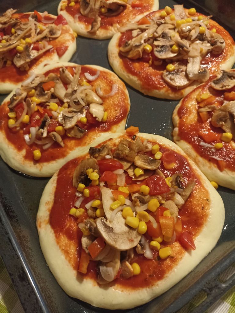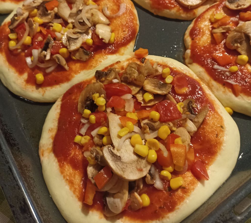 Poco prima che le pizzette abbiano terminato di lievitare, lavate e tagliate le verdure a fettine. Salatele leggermente e aggiungete il mais sgocciolato, quindi mescolate bene il tutto.