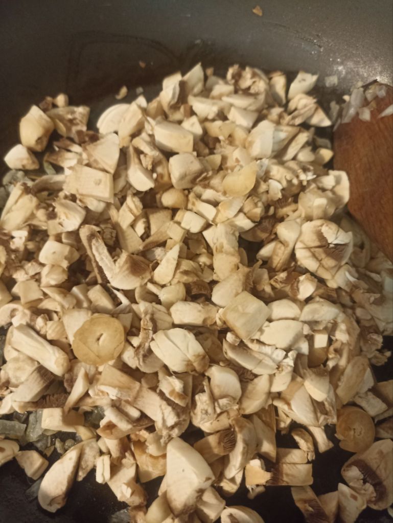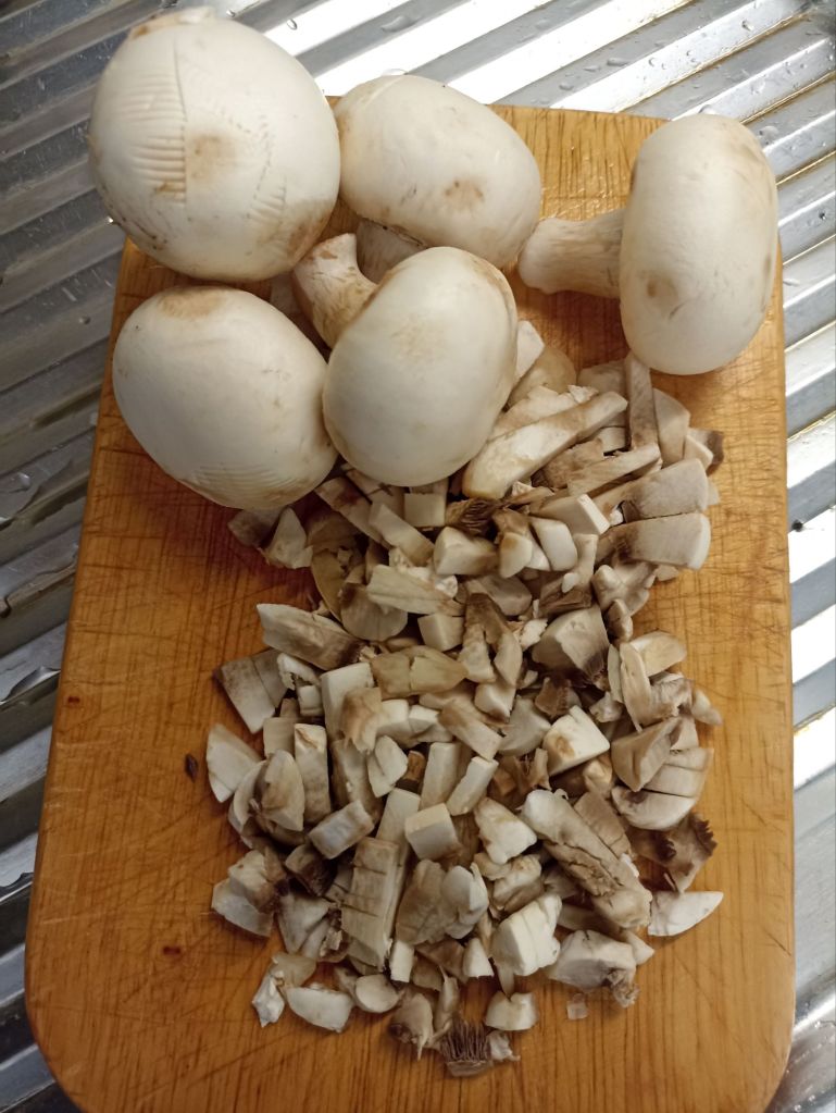 Pulite, lavate e tagliate i funghi Champignon a fettine